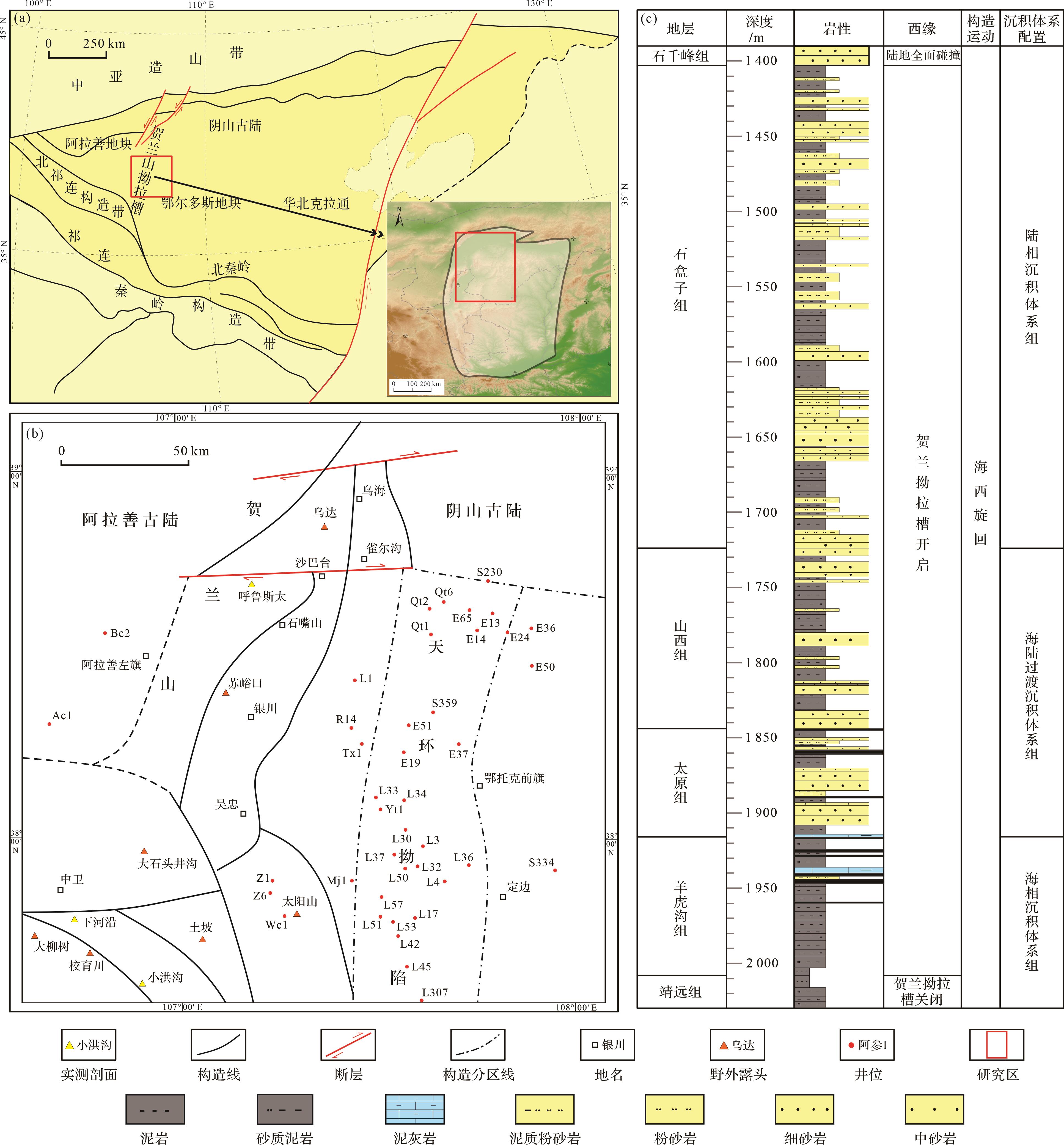 鄂尔多斯盆地位于华北板块西部,覆于华北板块古老基底之上[19]。研究区北起内蒙古乌海,南至小洪沟—土坡一带,西始Ac1井—中卫,东达鄂托克前旗(图1a)[20],处于阿拉善地块、华北陆块和阴山造山带交互作用地区,构造环境复杂(图1b)。晚古生代鄂尔多斯地区作为华北地台的一部分,构造演化和沉积充填受控于周缘造山带和洋盆的演化[21]。中新元古代的晋宁运动后,鄂尔多斯盆地进入稳定抬升阶段,内部形成坳陷,整体地形北高南低。进入晚古生代,位于华北陆块北缘的古亚洲洋开始向南俯冲,南缘的商丹洋俯冲完毕后,勉略洋也开始向南秦岭板块下的俯冲运动,在南北两侧古洋的共同作用下,盆地整体被抬升为陆地,结束了海相沉积的历史,开始逐步向陆相沉积过渡,到早二叠世晚期,盆地进入陆相沉积阶段[22]。