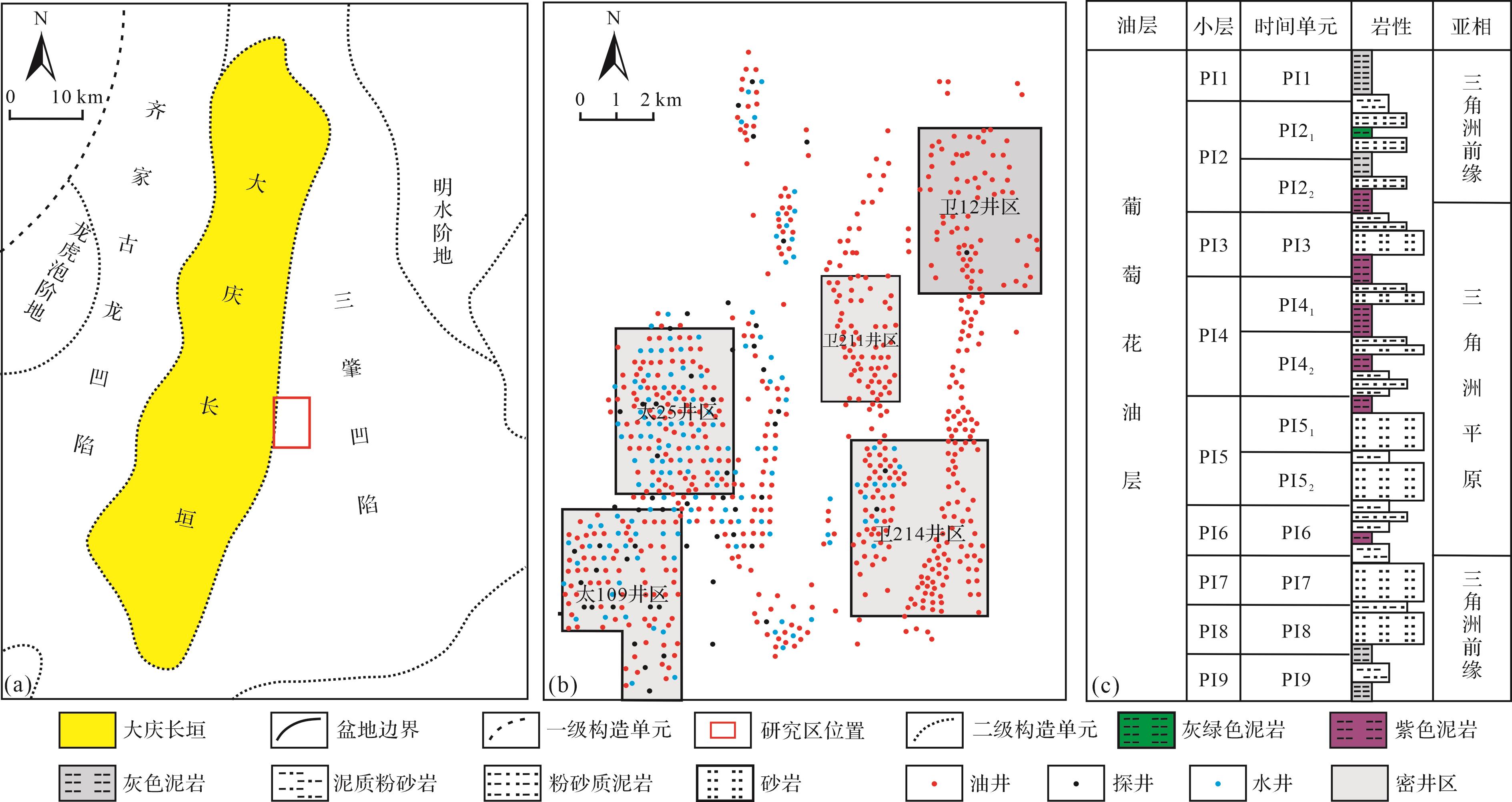 (a)松辽盆地北部构造图及卫星油田位置;(b)卫星油田开发区位置及井网分布;(c)葡萄花油层柱状图