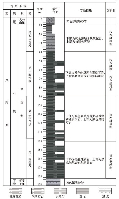 烟溪组岩性较复杂,但纵向分布具有一定的规律性(图 1)。烟溪组底部(第一岩性段)常为黑色、灰黑色薄层状硅质岩,平均为10.4 m;烟溪组下部(第二岩性段)为黑色碳质页岩、页岩、粉砂质页岩和泥岩,常夹有黑色薄层状硅质岩,该段平均厚度为15 m;烟溪组中部(第三岩性段)为硅质岩或硅质岩与碳质页岩互层,平均厚度为25 m。该段硅质岩为黑色薄层状,但累计厚度较大;烟溪组上部(第四岩性段)为碳质页岩、粉砂质页岩和砂岩沉积,该段平均厚度18 m。