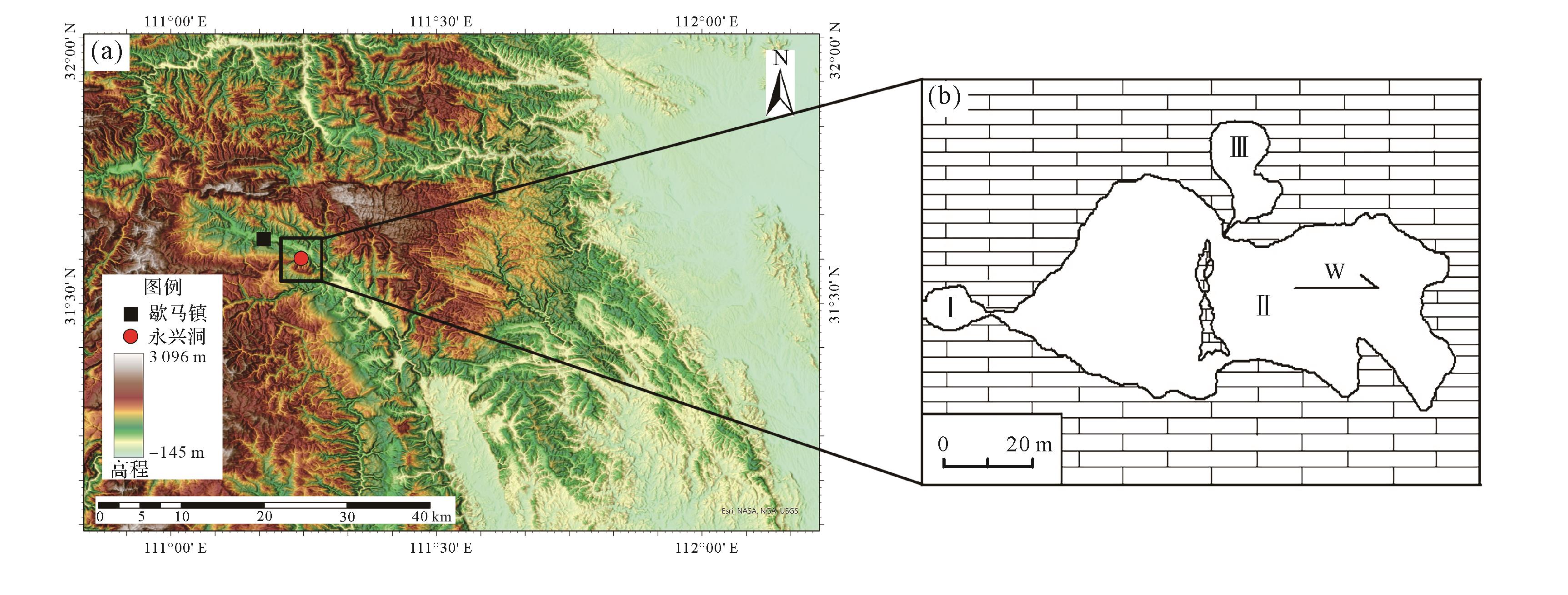 永兴洞位于湖北神农架地区保康县歇马镇东10 km处(图1a),其经纬度为31º35′3.7″ N,111º14′42.3″ E。该地区属扬子准地层区的大巴山—大洪山分区,以山高、坡陡、谷深为主要特征,石灰岩分布广泛,山势峭拔。该地区属于亚热带季风气候,主要受亚热带气候环流系统控制,大部分地区年霜期超过200天,且具高山气候的特点[22]。