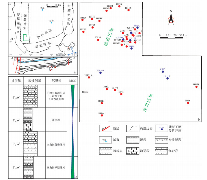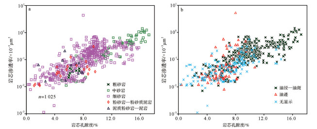 大量的岩芯分析资料表明,低孔渗储层的物性与含油性之间具有一定的相关性(图 3b),砂岩的含油产状随着物性变好而变好,由此根据含油产状对储层物性下限进行确定。多数油田含油级别达到油迹及油斑以上级别即可出油[24-26],由此长8油层组孔隙度下限为8.0%,渗透率下限为0.10×10-3 μm2。