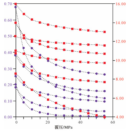由于沉积微相对储层物性起控制作用,选取代表不同沉积微相的HH12和HH105井对储层临界物性进行厘定。通过进行压力演化史(图 9)恢复,长8段地层现今埋深等效压力约为45 MPa,经历最大埋深时地层压力为60 MPa左右,由覆压孔渗实验(图 10)可知,长8段地层的压实作用持续至今。因此,在进行孔隙度预测之前,需要对地层进行去压实恢复及剥蚀量恢复。