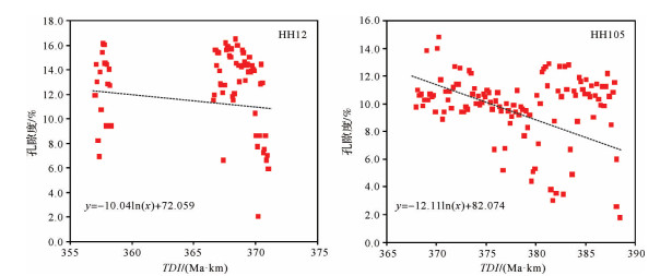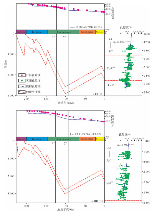 (13) a代表各种沉积和成岩参数对孔渗的综合影响,它综合反应了诸如颗粒粒径、矿物分选性、岩性岩相、早期压实、胶结、溶蚀等多种因素的影响。利用HH12、HH105拟合方程对孔隙度进行预测,利用现今实测孔隙度(ϕ)及初始孔隙度(ϕ0)对预测孔隙度曲线进行端点约束(图 11)。