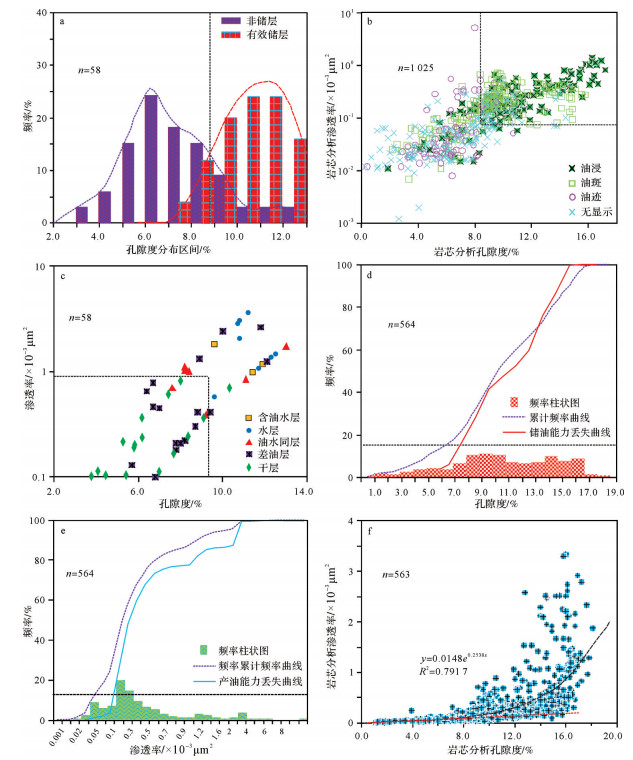 通过在坐标系内分别绘制有效储层(主要包括油层、油水同层、含油水层及水层)与非储层(主要包括干层、差油层)的物性频率分布曲线[20-23],基于58个样品点所得两条曲线的交会点(图 3a)可知长8油层组孔隙度下限约为9.0%,利用孔隙度—渗透率交会图拟合孔渗关系(图 3f)得到渗透率下限约为0.15×10-3 μm2。
