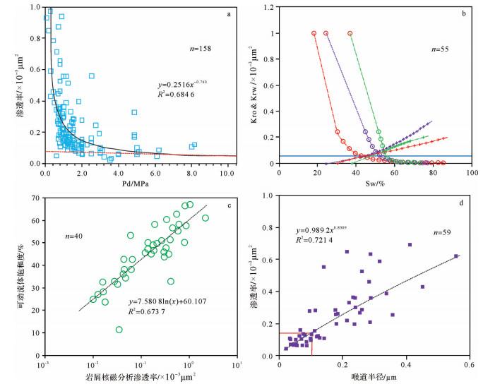 前人一般利用油水相渗曲线的交叉点(等渗点)对应渗透率作为储层渗透率的下限标准[29-30],通过对工区内3口井利用非稳态法测定各油层组油水相对渗透率(图 4b),由此长8油层组孔隙度下限分别为4.8%,渗透率下限分别为0.05×10-3 μm2。