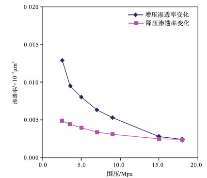 (4)通过对HH103、HH12等井的长8储层进行应力敏感性分析,由于送检样品渗透率均小于1×10-3 μm2,不能满足行业标准SY/T5358—2002测试规范渗透率不小于1×10-3 μm2的要求,且由于储层早已致密化,增压过程中应敏较小(图 6),可能导致误差较大,故致密储层不宜采用此方法进行划分。