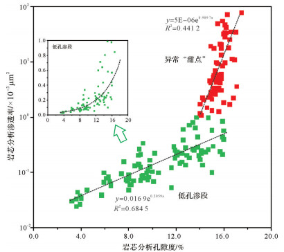(5)因致密储层一般裂缝较发育,导致“甜点”异常发育,由孔隙度储油能力、渗透率产油能力计算公式(公式2)所得累计曲线中储层“甜点”所占权重较大,导致误差较大。另外,储层“甜点”异常发育(图 7),可能导致孔渗关系无法确定孔渗曲线的“三段式”,故对于裂缝极其发育的致密储层,经验统计法及孔渗交会法也不适用。