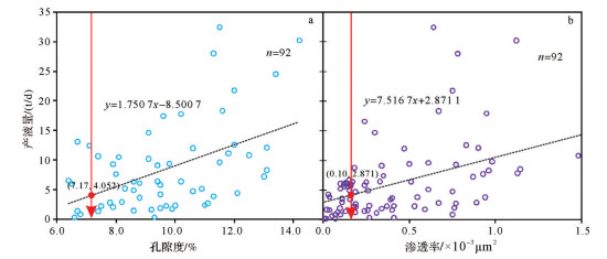依据石油天然气行业标准[40],油层埋深1 000~2 000 m时,试油产液量必须 > 1 t/d属于工业油层,油层埋深2 000~3 000 m时,试油产液量必须 > 3 t/d属于工业油层。通过对长8油层组试油层段的产液量与储层物性进行交会(图 8),可知按照上述综合取值,有效储层最低产液量为2.871~4.052 t/d,符合该地区致密储层的工业油流标准。