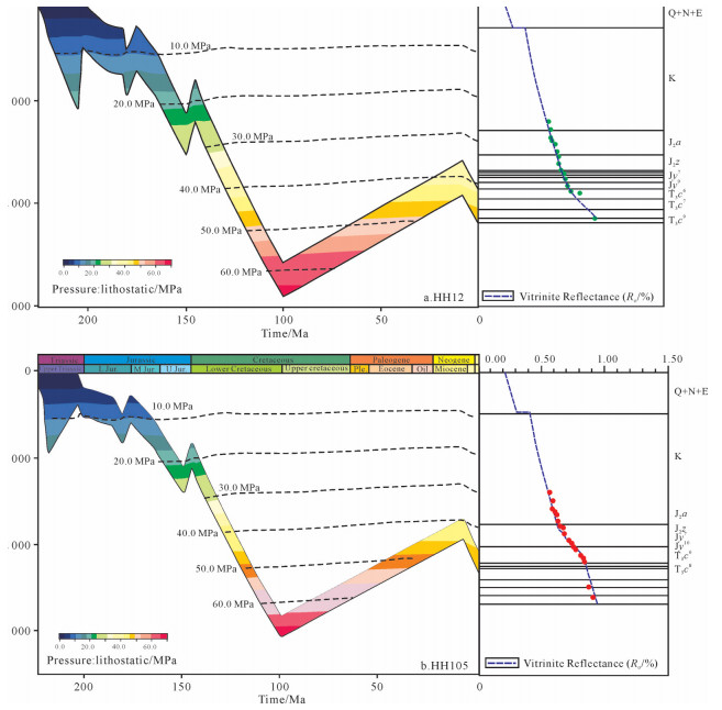 (3) 式中:ϕ(h):孔隙度;ϕ0:初始孔隙度;c:压实系数(1/m);h:埋深。根据不同深度地层岩石的孔隙度测量值,在对数坐标中拟合指数函数做出ϕ-h关系曲线(图 11),从而可以得到HH12井ϕ0为45.458%和c为0.000 3;HH105井ϕ0为48.738%和c为0.001。从初始孔隙度和压实系数来看,HH12可能以砂岩为主,和HH105岩性可能以泥岩为主,这与两口井延长组沉积期沉积微相不同有关[15, 17]。可用压实系数来恢复沉积地层在不同地质时期的原始地层沉积厚度,即去压实恢复[36-38]。