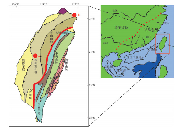 台湾为板块俯冲增生的产物[8],其大地构造演化时间大致可以分为以下几个阶段(图 2):1)陆缘断陷盆地阶段(45~34 Ma),以陆相河流—湖泊沉积为主,间夹火山碎屑沉积,其基底为中生代—古生代陆相—浅海相碎屑沉积岩或变质岩,此时由于断陷活动产生了地堑—半地堑张裂盆地;2)海底扩张阶段(34~16 Ma),该时期台湾地区作为南海北部的一部分经历南海海底扩张[16];3)洋壳俯冲阶段(16 ~ 6.5 Ma),南海洋壳沿马尼拉海沟向东俯冲于菲律宾板块之下,同时,原陆棚、陆坡沉积物及深海浊积层被刮积形成增生楔;4)弧陆碰撞阶段(6.5 Ma至今),北吕宋岛弧与欧亚大陆边缘发生斜向弧陆碰撞造山运动,使沉积在被动大陆边缘的地层向西逆冲,褶皱隆升出露于海平面之上形成台湾造山带[7-8]。