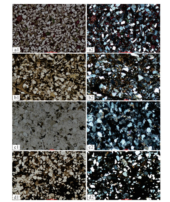 早渐新世砂岩粒径100 μm,分选良好,颗粒含量67%,杂基30%,胶结物3%。次棱—次圆状,碎屑颗粒以石英为主,占70%左右,岩屑28%,长石2%。碎屑颗粒边缘溶蚀交代现象普遍发育;石英常见次生加大边。岩屑以燧石岩屑为主,部分火山岩岩屑和少量变质岩屑,长石颗粒含量较少。胶结物主要为黏土亮晶,少量方解石。泥质杂基含量达到30%(图 3B)。