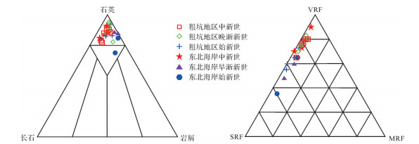 台湾粗坑地区和东北海岸两地的样品由于含有大量石英质燧石岩屑,因此样品中普遍石英含量较高,整体上表现为石英砂岩,成熟度较高。两地区各时代间砂岩成分变化不明显,在粗坑地区晚渐新世砂岩成分成熟度最高,以石英砂岩为主,始新世及中新世均以长石石英砂岩和岩屑石英砂岩为主;在东北地区从始新世到中新世砂岩成分成熟度明显增高。岩屑类型上,样品表现为火山质岩屑为主,泥质岩屑也有一定含量。同时,东北和粗坑两地均呈现随地质时代演变火山质岩屑增多的现象(图 4)。