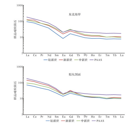 由样品球粒陨石标准化的REE配分模式结果(图 5)可见,两地始新世—中新世各地质时代的沉积物样品均出现了典型的上地壳稀土元素特征,表现为轻稀土富集、重稀土亏损,Eu元素表现为负异常。各地质时代间并未出现明显的差异,也未显示出随时间变化的趋势。