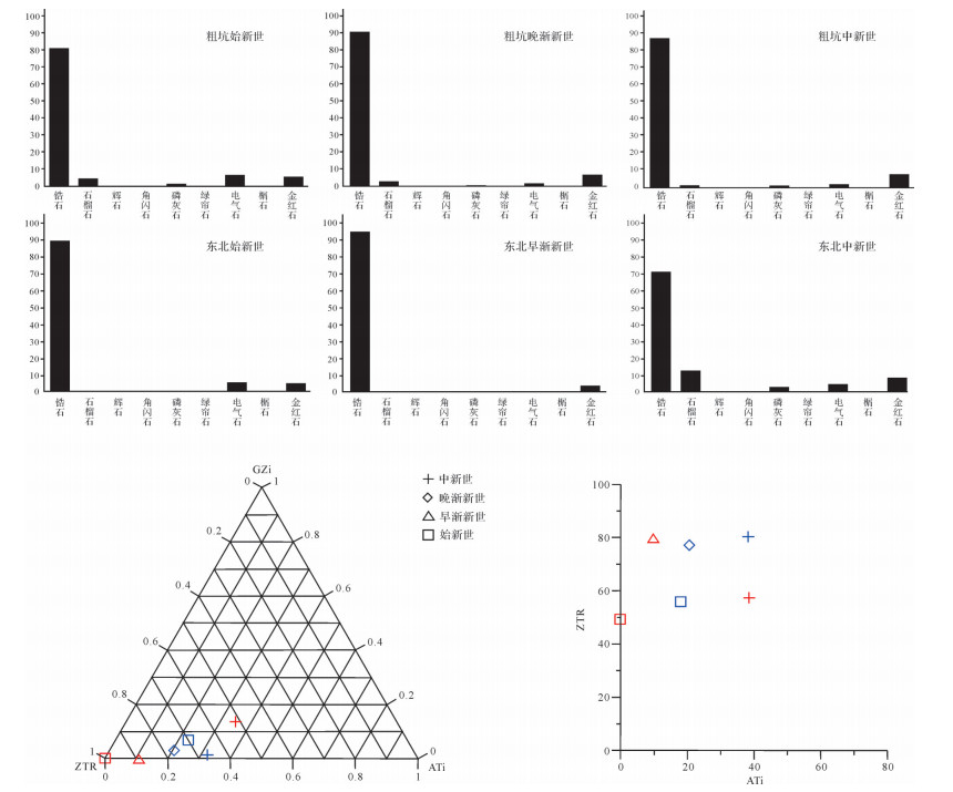 粗坑地区的重矿物组合在始新世主要含有锆石和少量石榴子石、磷灰石、电气石、金红石。其中,锆石含量为80%,稳定矿物含量较高,而代表岩浆岩母岩的石榴子石以及接触变质岩的电气石也有记录,而绿帘石含量几乎为零,说明母岩区变质岩较少。整体上,粗坑地区始新世表现为母岩为岩浆岩的特点。进入晚渐新世以后,锆石含量进一步增加,达到了近90%,而石榴子石和电气石含量降低,锆石+金红石的稳定矿物含量达到了95%以上,说明沉积物整体成熟度较高。中新世时期与晚渐新世时期相似,同样表现为大量稳定矿物富集,指示来自岩浆岩母岩的矿物含量减少。东北海岸地区始新世和早渐新世均表现为大量稳定矿物富集,含有少量电气石,而表示岩浆岩母岩的石榴子石数量较少。到了中新世,台湾东北及粗坑地区均呈现出稳定矿物含量下降,不稳定重矿物含量明显增多的现象(图 6)。