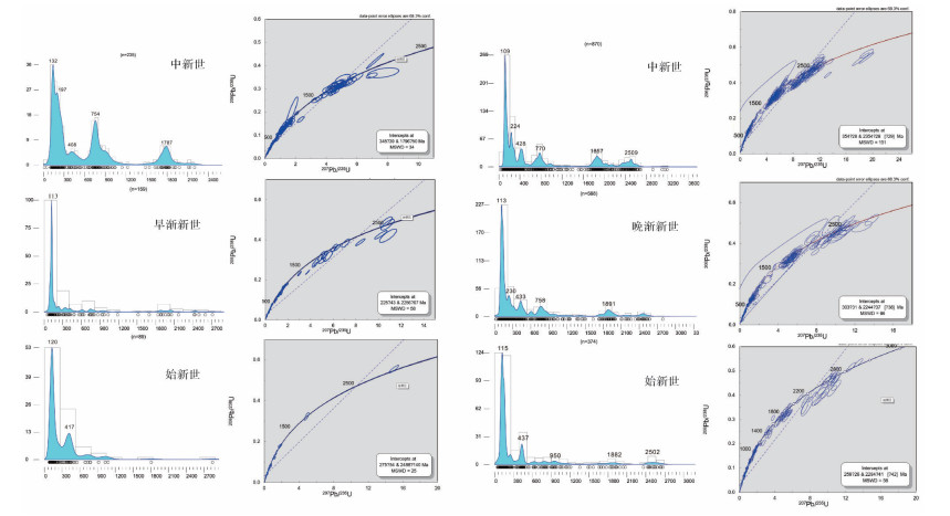 粗坑地区晚渐新世9个样品共计588个数据点,中新世10个样品共计870个数据点。两个时期的锆石年龄频谱图显示一定的相似性,而相对于始新世则有明显的差异。其中,较为年轻的锆石(< 500 Ma)数量依然处于绝对优势,而110 Ma左右的燕山期锆石数量依然最多,此外中生代早期印支期(230 Ma左右)的锆石分化出了明显的次峰。430 Ma左右加里东期的锆石也有明显的峰值。与始新世时期不同的是,晋宁期和吕梁期的较老年龄锆石数量明显提升,两个时期频谱图在760 Ma和1 870 Ma左右均有明显的峰值,而中新世样品在2 500 Ma的吕梁期锆石数量也较为突出。总体上看,粗坑地区从晚渐新世碎屑锆石年龄分布发生明显改变,样品中古老锆石年龄含量明显增加,显示沉积物源区应发生明显改变,中新世碎屑锆石年龄谱系特征与晚渐新世基本相同。