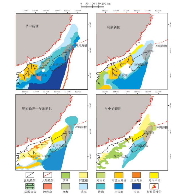 台湾在始新世时期主要为辫状河—沼泽相沉积环境,水深较浅,水动力较强,整体为陆相环境。破裂不整合之上的晚渐新世地层开始大量出现海绿石颗粒和海相生物化石,指示沉积环境由陆相转为滨浅海相。早中新世以后水深进一步加深,沉积地层出现了浅海、半深海相沉积,部分地区发育碳酸盐沉积(图 8)。