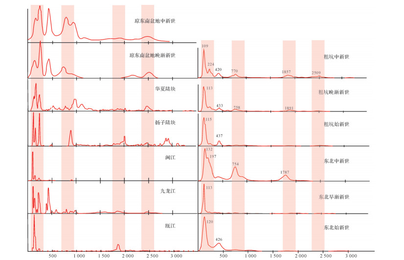 东北海岸始新世两个样品共计89个数据点,早渐新世两个样品共计159个数据点,锆石年龄频谱图从始新世到渐新世基本相似,以年轻锆石(< 500 Ma)数量占据压倒性优势。其中,始新世锆石频谱主要表现120 Ma的燕山期峰值和417 Ma的加里东期峰值,且燕山期锆石数量超过50%;早渐新世锆石年龄以113 Ma左右燕山期的锆石数量超过80%,加里东期锆石仅有少量分布。到中新世4个样品235个数据点显示出与始新世和早渐新世较为明显的差异。虽然中生代的锆石依然最多,以132 Ma左右燕山期为主,200 Ma左右燕山期早期发育次峰,但是较老年龄的锆石分布明显增多,其中754 Ma左右的晋宁期和1 787 Ma左右的吕梁期均有明显的峰值,在408 Ma发育次一级的加里东期峰值,总体上锆石年龄谱系分布范围明显扩大。