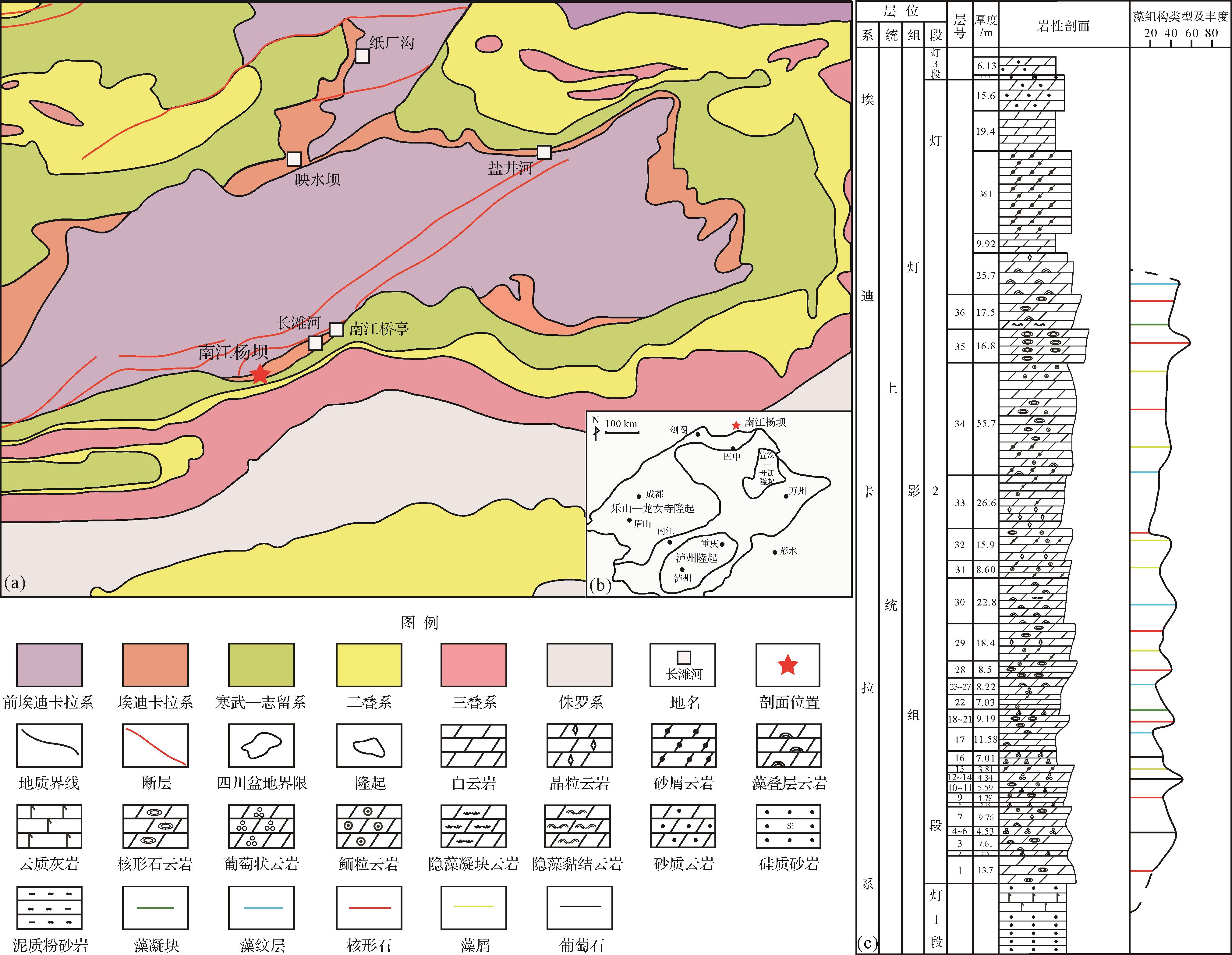 杨坝剖面位于四川省南江县,构造上位于四川盆地北缘米仓山前缘构造带南侧,是米仓山构造带灯影组出露非常完整的剖面(图1a,b)。米仓山地区归属于扬子地台北缘,与东面的南大巴山褶皱冲断带一起共同构成位于秦岭造山带和四川盆地稳定克拉通之间的前陆褶皱冲断带,是造山带与盆地之间的过渡带,具有典型的前陆冲断褶皱带特征[31-32]。