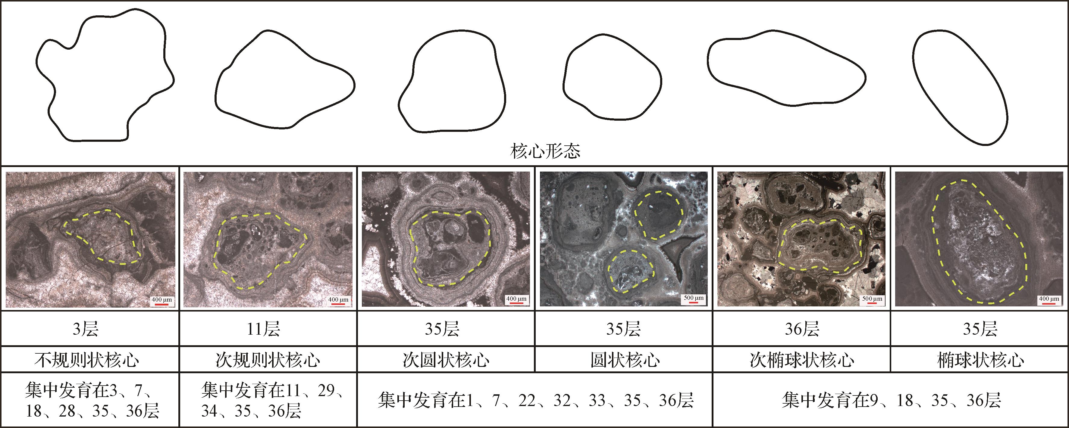 核形石通常是由核心与包壳纹层两部分组成,二者相辅相成,共同决定了核形石的粒度、形态等,是核形石分类的重要依据。