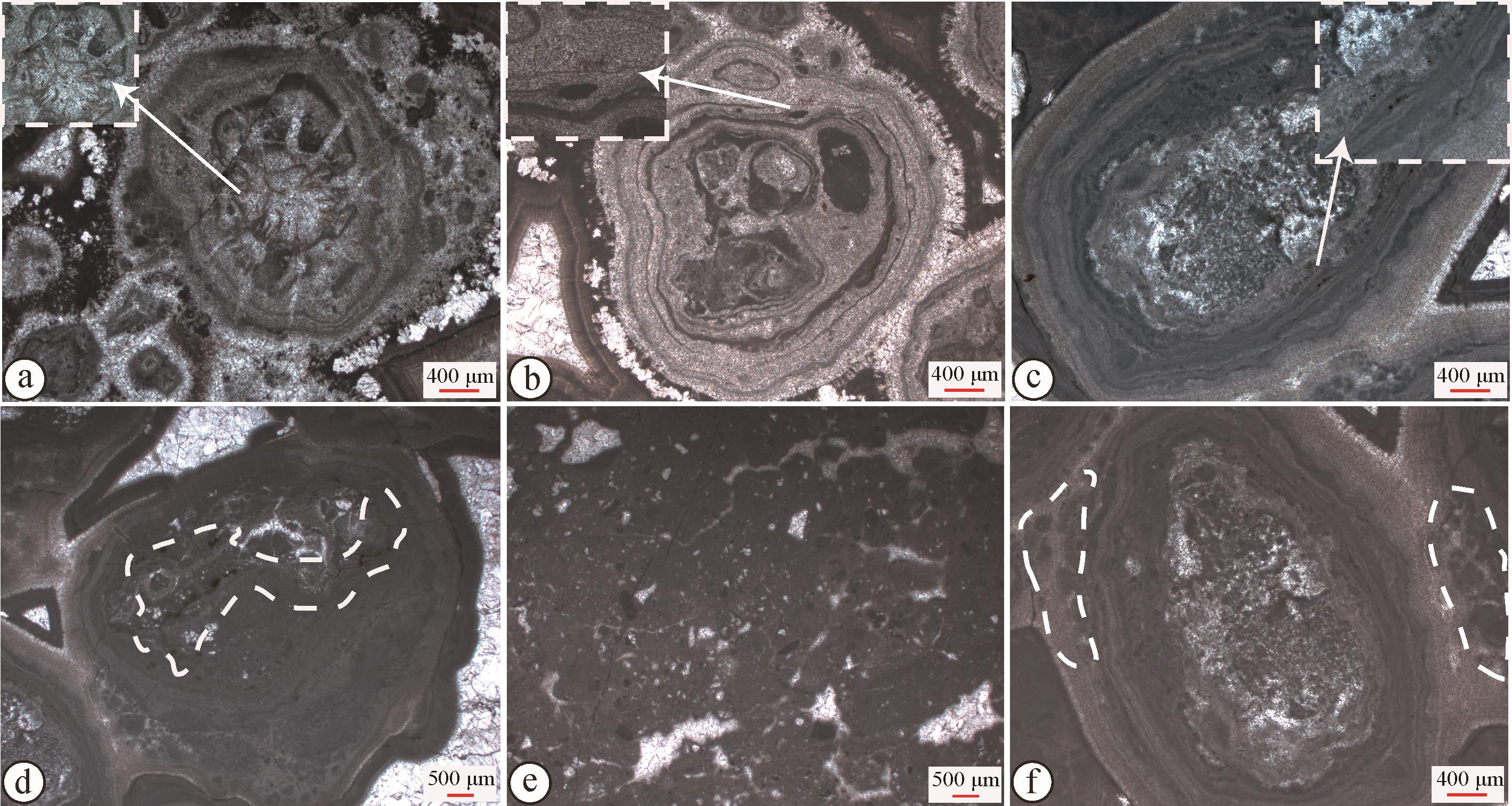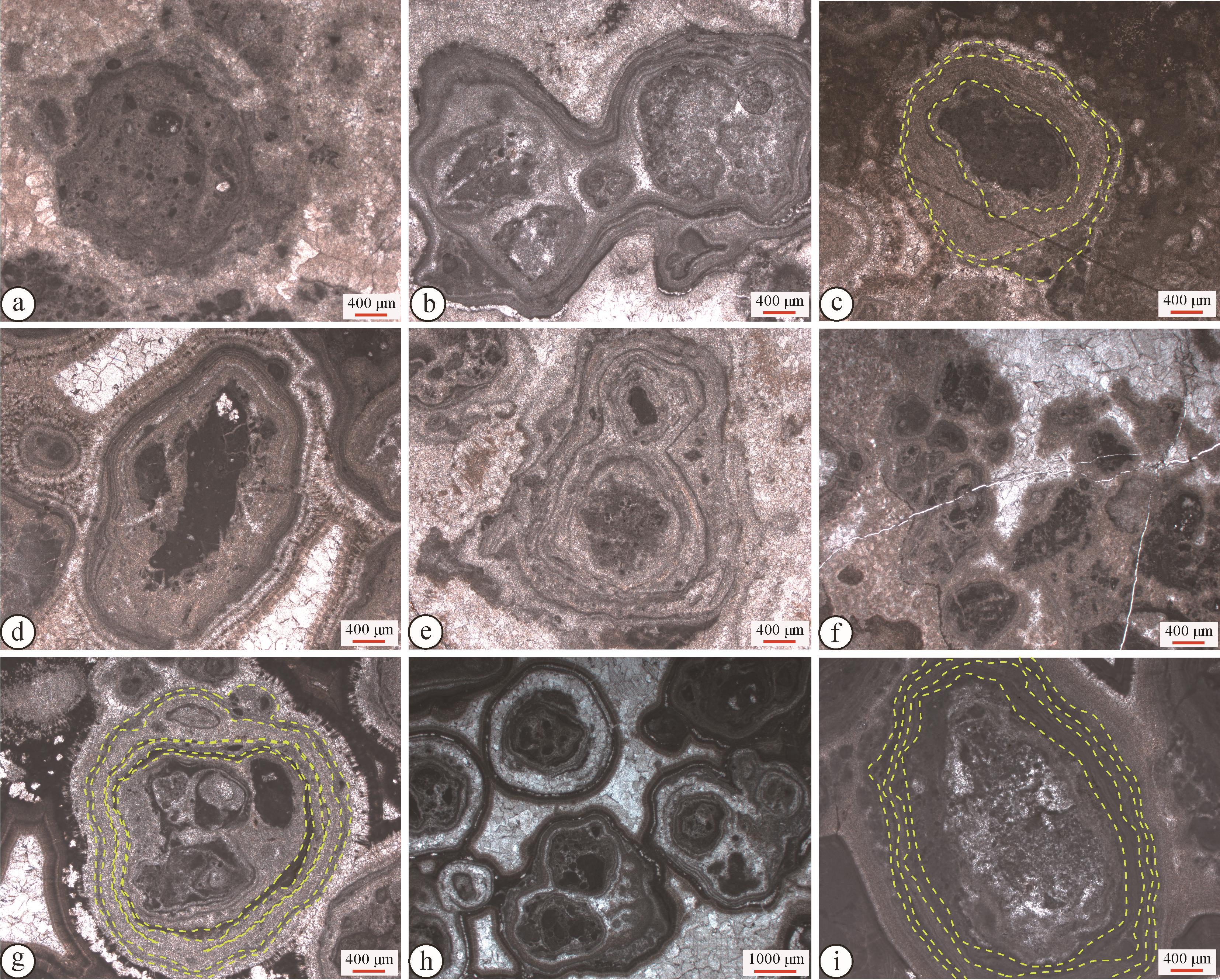 (2) 椭圆状核形石:椭圆状,集中发育在下亚段中上部和上亚段中上部。核心形状为次椭球状、椭球状(图5f),纹层发育完整,平直规则、单层厚度稳定、明暗纹层分界清晰。核形石长轴直径2.5~6 mm,集中在4.4~6 mm,短轴直径1.75~4.5 mm,集中在3~4.5 mm;核心长轴直径1.5~3.6 mm,集中在3.2~3.6 mm,短轴直径1~2.5 mm。下亚段核形石核心和包壳泥质含量均较高,核形石整体颜色较深;向上亚段,核心亮晶物质增多,整体规则泥晶纹层极其发育,偶见不规则断续状泥晶纹层,纹层薄而密集,单层厚度均匀,包壳纹层以规则泥晶纹层—亮纹层—规则泥晶纹层—亮纹层—规则泥晶纹层等组合而成,围绕核心形态缠绕展布。亮纹层泥质含量较高,规则泥晶纹层中见沿圈层局部分布的黄铁矿。椭球状核形石核心多为次椭球状大核心,由砂屑、砾屑、微泥晶团块等共同组成;此类核心应是在水体能量较强时形成,核形石悬浮、半悬浮状留存于水体中,微生物围绕核心均匀生长;后在周期性的动荡水体持续时间较长,至未形成规则且连续的明暗纹层。此类核形石自身和核形石之间藻类包裹缠绕痕迹残留明显,应是核形石形成后未经长距离搬运,水流改造作用弱。