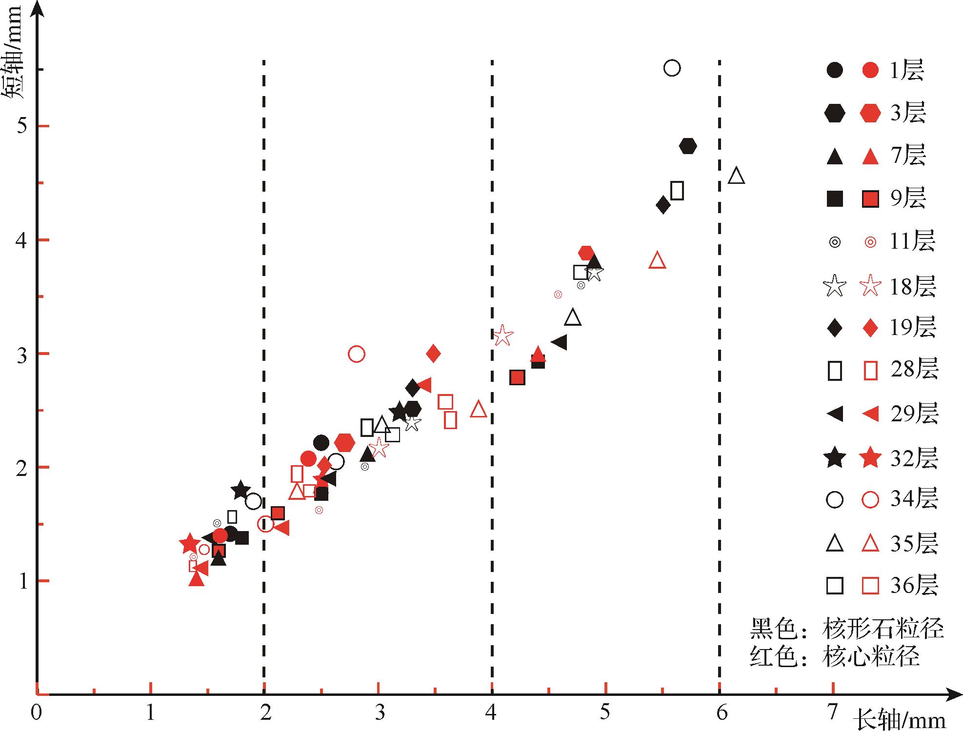 对于次规则、次圆状的小核心,随着纹层厚度增大,最终形态可发展为次圆状、圆状,且壳纹层分布构造、连续;这可能是核心在悬浮状态下藻类受到较均匀的光照而在各个方向均匀生长,形成规则的圆形且连续的藻类纹层等[16,26]。对于次椭球状的大核心,随着纹层厚度增大,最终形态仍保持椭球状,表现为形态上相对更加规则;可能因核心过大,虽然水动力增加了,致使其在水中悬浮因藻类作用包裹缠绕形成明暗纹层,但是持续时间太短,还不至于抵消核心对其形态影响。将核形石长轴分为0~2 mm、2~4 mm、4~6 mm、6~8 mm范围,核形石整体粒径分布在1~4 mm范围内,少量分布在6 mm左右。整体上,核心粒径与核形石粒径具有良好的对应关系,并且长短轴比值较大(图4)。