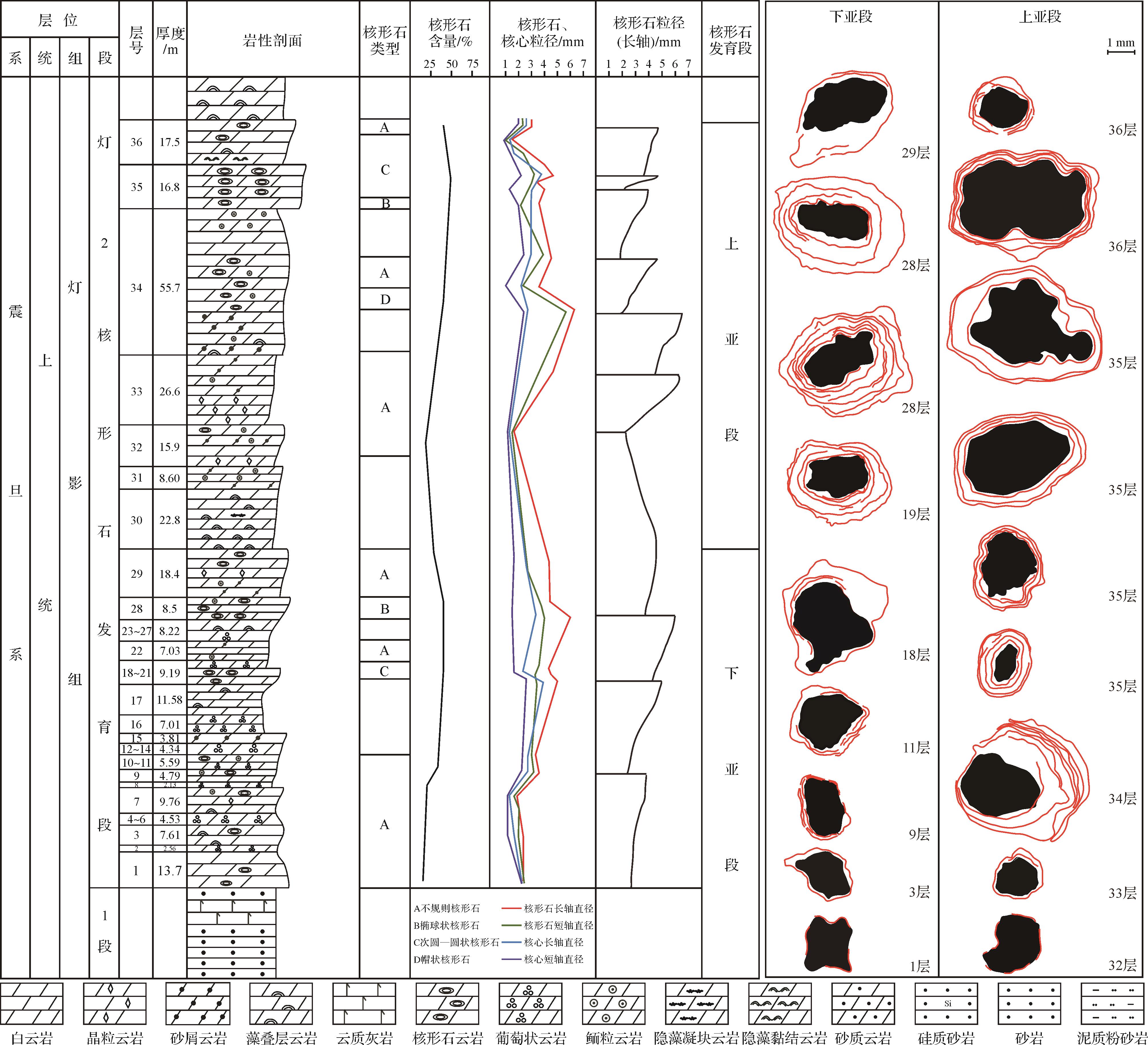 (2) 将核形石划分为4类,其中不规则核形石主要分布在灯2段核形石发育段下亚段下部,核心泥质含量较高,壳层不连续、杂乱分布;椭圆状核形石发育在下亚段中上部和上亚段中上部,核心多为次椭球状大核心,由砂屑、砾屑、微泥晶团块等共同组成,纹层完整、平直规则、单层厚度稳定、明暗纹层分界清晰;次圆状—圆状核形石上下亚段均发育,核心直径呈轻微不规则,包壳主要由规则纹层—亮纹层—规则泥晶纹层组成;似半球状或帽状核形石纹层分布不均,较厚侧纹层主要为不规则波状泥晶纹层—亮纹层—不规则波状、断续泥晶纹层,纹层半连续为主,较薄侧纹层单一、以暗纹层为主。