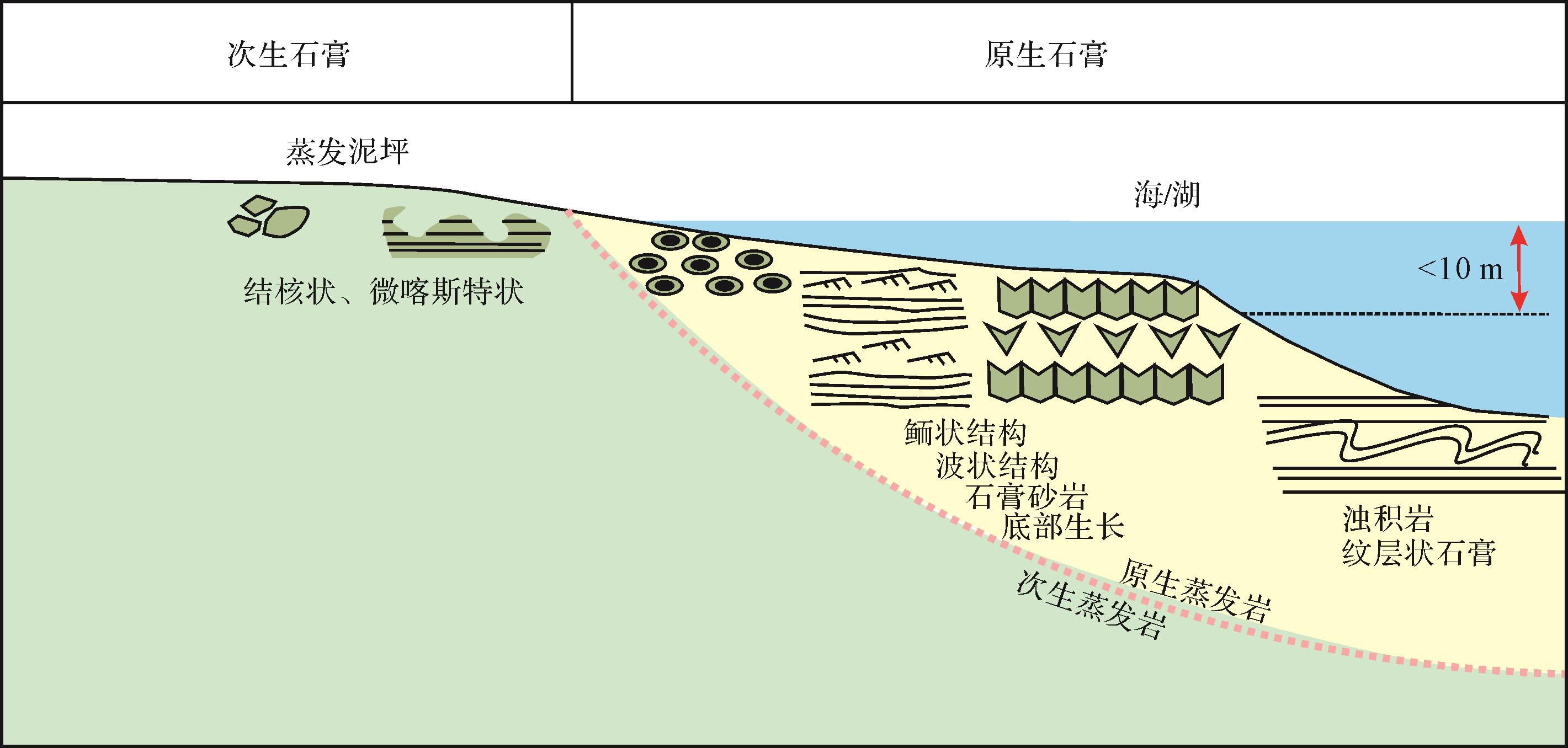 萨布哈环境最明显的特点就是沉积物大部分暴露在水面之上,容易受风吹、大气降水和地下水的影响。在萨布哈沉积相的最顶部,由于蒸发加剧盐水蒸干,沉积物表面受暴晒导致干裂,沉积物直接暴露,表面发育为帐篷构造灰岩(Ct)、多边形断裂和帐篷构造石盐壳(Hpt)等。除了干裂构造,萨布哈表面常见松散堆积的光卤石角砾(Db)等蒸发盐堆积物、有成壤特征并可能发育植物的泥质结构石膏土(GSm),石膏土的下部岩相为石膏砂,来源于强风对石膏颗粒的分选和改造,最典型的是阿拉伯湾的夏马风,风的机械作用下可以把盐沼上漂浮的晶筏石盐吹到岸边堆积或者把原始的岸边松散堆积发育呈风成层理,如X型层理石膏砂(GSx)。当极度干旱季节结束,随着大气降水或河流的到来,暴露的石盐岩受到明显的淡水溶解作用形成次生构造如鱼骨状底部成核层石盐岩(Hfb)和喀斯特溶洞/微喀斯特洞状充填石盐(Hk)。当石盐溶解的盐水渗透到帐篷构造石盐下方,由于盐度达到石盐沉淀浓度,常见石盐钟乳石发育(钟乳石石盐岩;Hs)。在季节性洪水期,沉积物受到阶段性强水动力,在石盐喀斯特和盐扰动结构石盐岩(Hht)内常见流水冲刷带入的砂泥和微生物混合堆积在一起。萨布哈的另一部分沉积物发育在浅的盐水下,盐沼的水浅、蒸发作用大、盐度高,因此大部分时间里,表现为弱水动力沉积构造,几乎不受生物扰动等机械作用的影响,以化学沉淀为主,呈纯的、少杂基的纹层—层状或块状蒸发岩,如层状白云岩(Dl)、块状/层状菱镁矿岩(Mm/Mlb)、底部生长石膏(Gbg)、纤维状/棱形柱状石膏(Gf/Gp)、透明块状石膏(Gm)、V字形晶底部成核层石盐岩(Hc)和漏斗形晶底部成核层石盐岩(Hh)等。在盐水波动频繁的地带常见结核状石膏/硬石膏(Gn/An)和结核—纹层状石膏(Gnl)岩相。结核状石膏可以同生沉积和早期成岩同时出现,结核状石膏/硬石膏从鸡笼铁丝状或肠状原生结构变为镶嵌结核状结构,此时原生石膏经历了早期成岩作用,发生石膏脱水作用并且石膏与硬石膏结核紧压在一起形成镶嵌结构,它们发生在地下水以上近盐沼处毛细管作用很强的蒸发带,且水体变浅的沉积层序中[117,162]。结核—纹层状石膏(Gnl)表明浅水(形成层状石膏)和陆上(先形成结节状硬石膏,硬石膏水化次生作用为石膏)环境的变化[118-119]。
