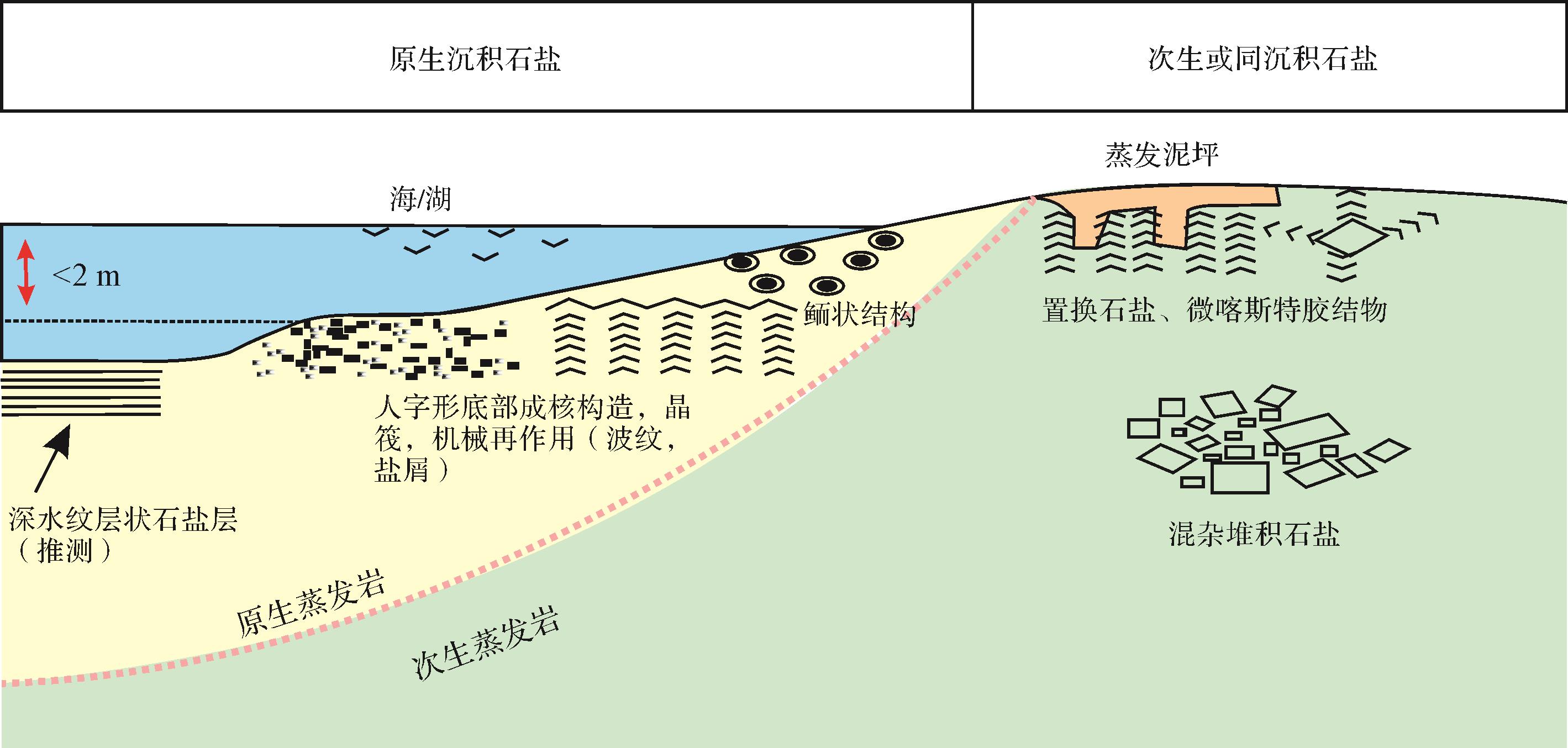 海相蒸发岩常出现在海岸萨布哈、潮上带、潮间和潮下带(包括潟湖和近海的海源局限盆地,它们仍然受到海水的影响,如海水渗流和特大潮海水补给),半深海或深海沉积的蒸发岩多半是机械再沉积的产物。在深盆深水蒸发模式下[161]可以沉积原始蒸发岩,这些沉积在深水环境的原始蒸发岩有明显的远洋特征,比如很薄的水平纹层构造,以及与碳酸盐互层沉积等。