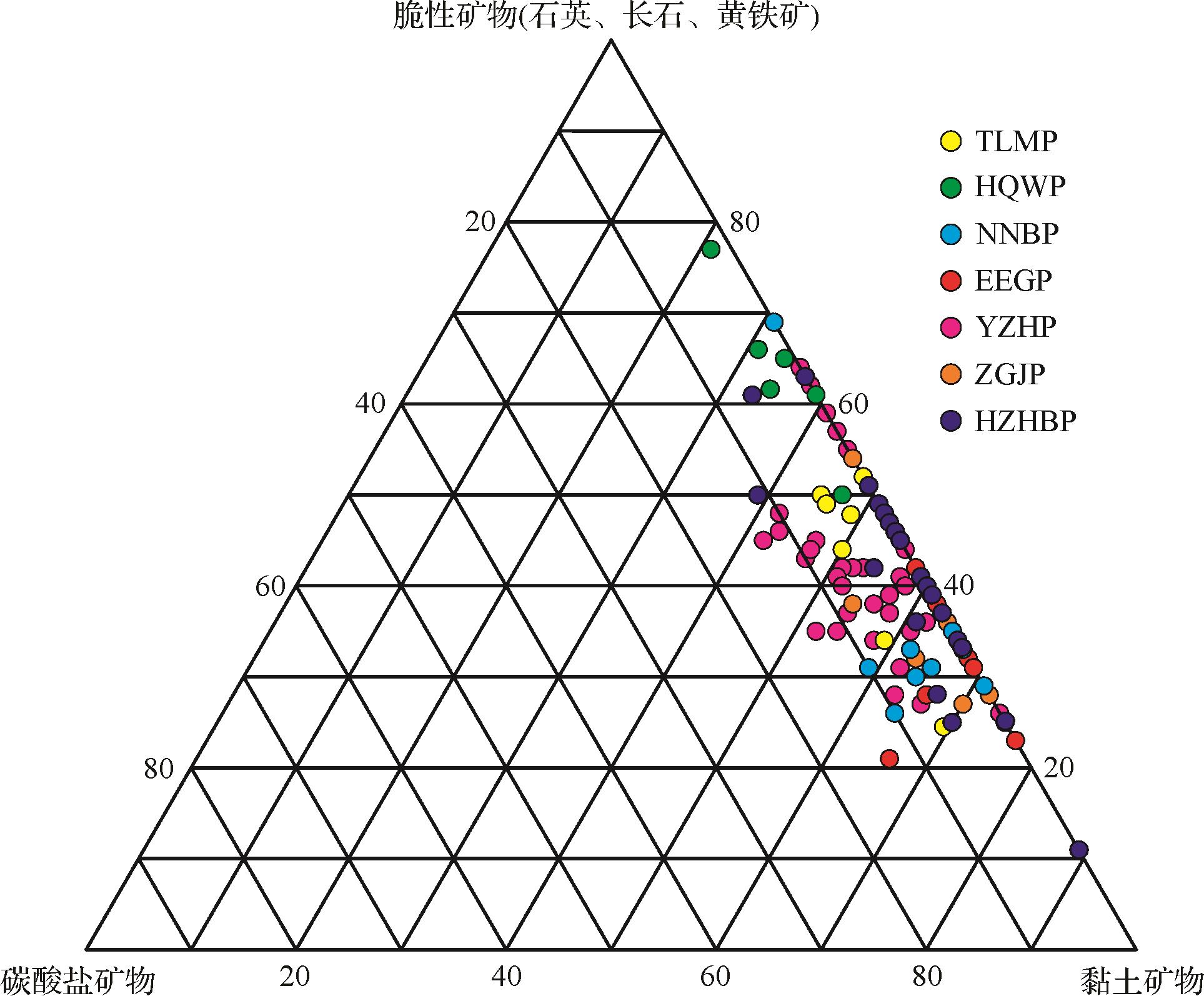 Figure 3. Triangle diagram of mineral components in organic⁃rich shale of the Upper Triassic Baiguowan Formation in the study area