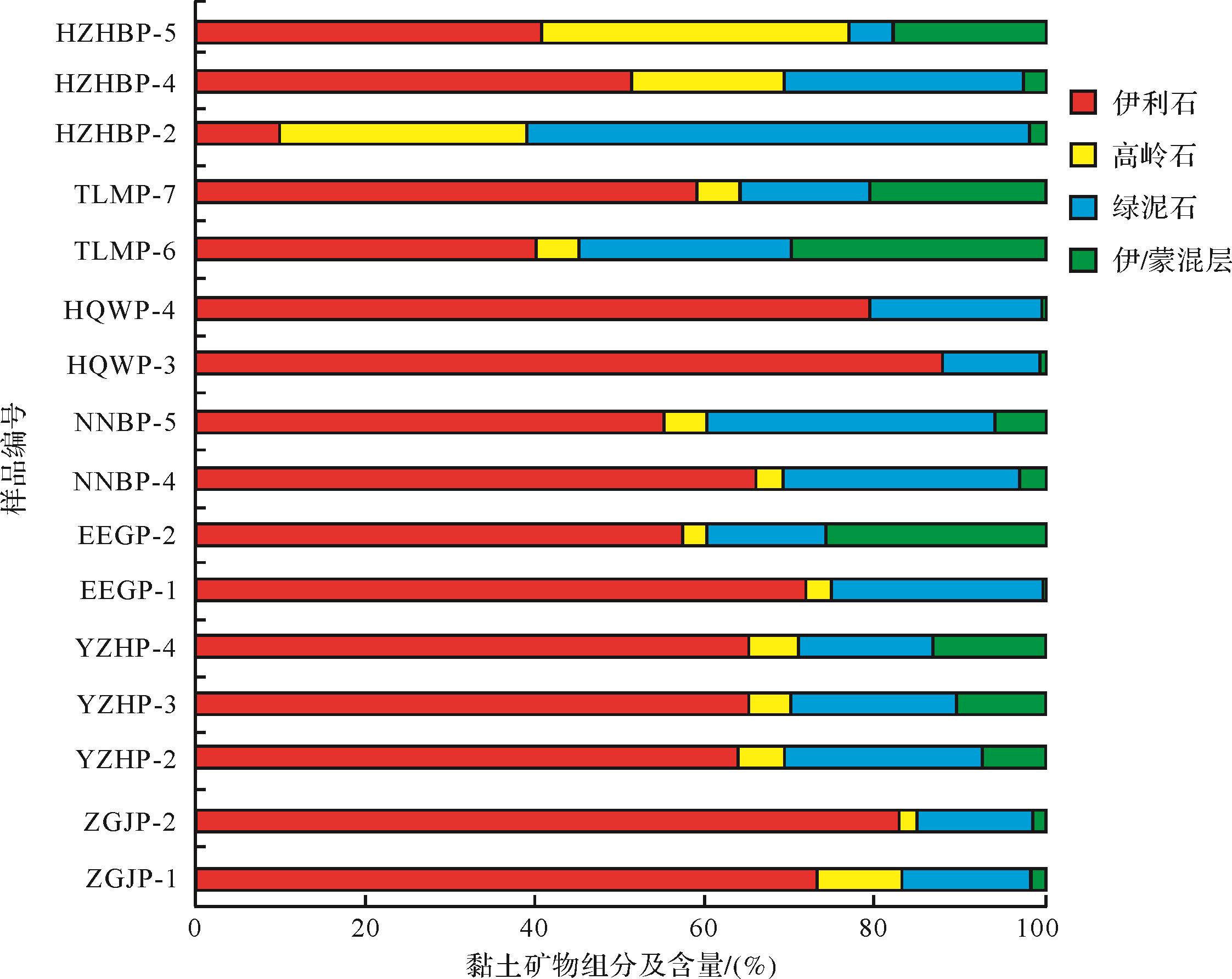 富有机质泥页岩黏土矿物主要为伊利石、高岭石、绿泥石、伊/蒙混层,其中,伊利石含量介于10%~88%,平均为60.2%,高岭石含量介于0~36%,平均为8.1%,绿泥石含量介于5%~59%,平均为21.9%,伊/蒙混层含量介于0~30%,平均为9.8%(图4)。