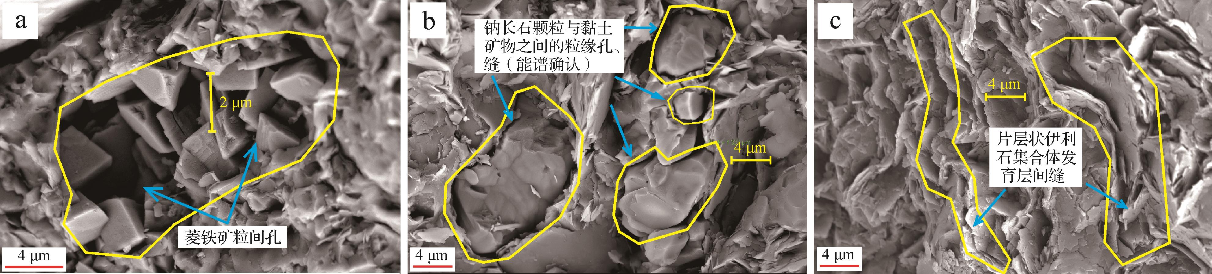 粒间孔主要包括矿物颗粒与矿物颗粒粒间孔(图5a)、矿物颗粒与片状黏土矿物粒缘孔缝(图5b)、片状黏土矿物与片状黏土矿物层间缝(图5c)。由于矿物颗粒与片状黏土矿物大小不一、形态各异,导致粒间孔孔径分布范围较广,粒间孔孔径介于0.1~5 μm,粒间孔连通性较好,既可作为页岩气的运移通道又可作为页岩气的储集空间。