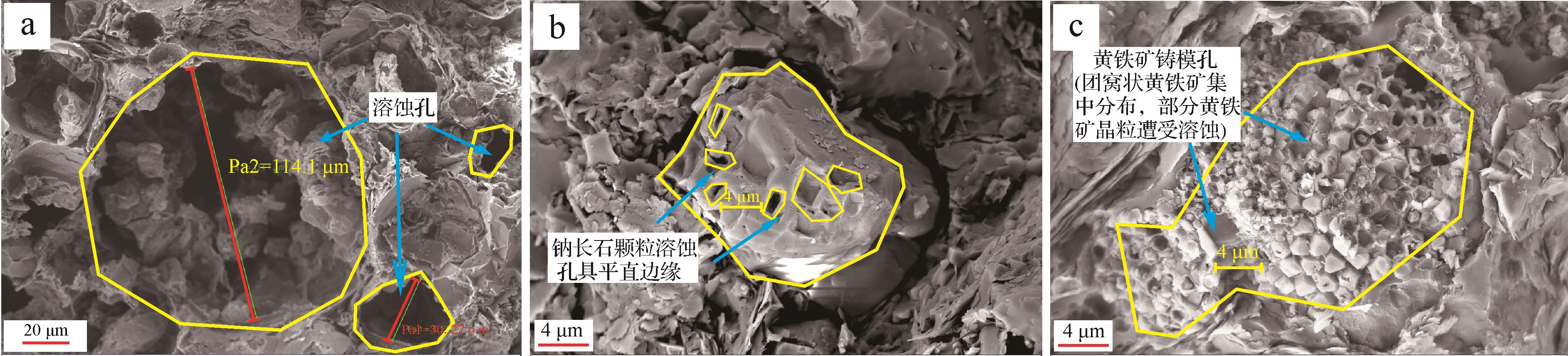 粒内孔是黑色泥岩矿物颗粒内发育的孔隙,以溶蚀孔为主,且种类较多,常见于碳酸盐岩颗粒溶蚀孔(图6a)、钠长石颗粒溶蚀孔(图6b)、黄铁矿晶粒溶蚀后形成的铸模孔(图6c),溶蚀孔孔径分布范围主要为0.1~6 μm,连通性较好。