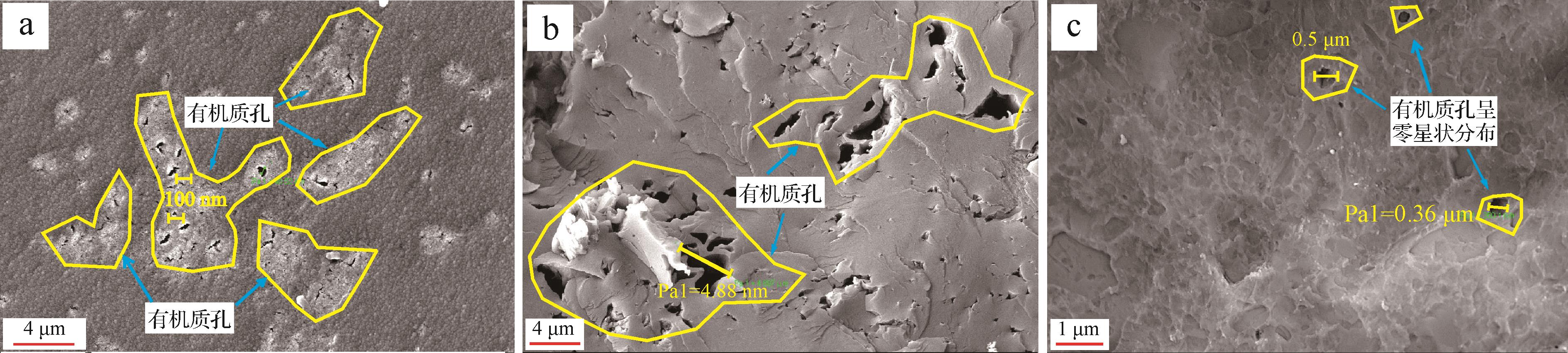 有机质孔是有机质在生烃过程中形成的孔隙,不同区域,甚至同一颗有机质的不同部位发育的有机质孔,在数量、孔径、形态等方面存在巨大差异[31]。西昌盆地上三叠统白果湾组富有机质泥页岩有机质孔孔径分布不均,形态各异,孔径主要为0.2~5 μm,部分孔壁较为圆滑,在昭觉一带有机质孔发育较好,且具有较好的连通性,在ZGJP剖面附近富有机质泥页岩有机质孔发育较差,有机质孔零星分布(图7c)。