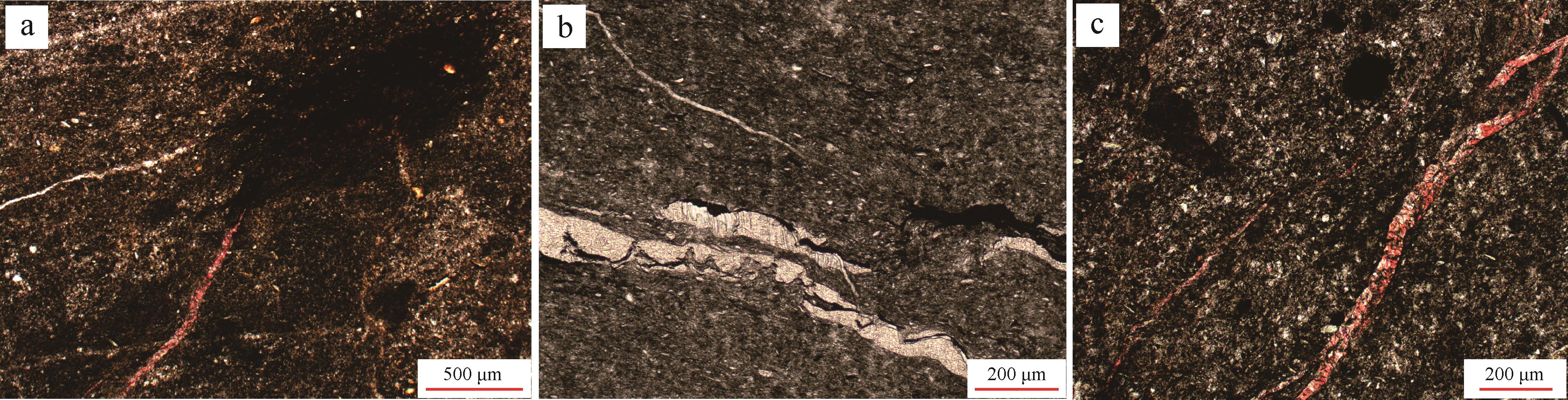 微裂缝即可作为页岩气的运移通道又可作为页岩气的储集空间[31⁃32]。研究区上三叠统白果湾组富有机质泥页岩中微裂缝较为发育,充填物主要为方解石、石英,部分微裂缝中充填少量有机质,缝宽主要为0.01~0.1 mm(图8),可作为页岩气良好的储集空间。