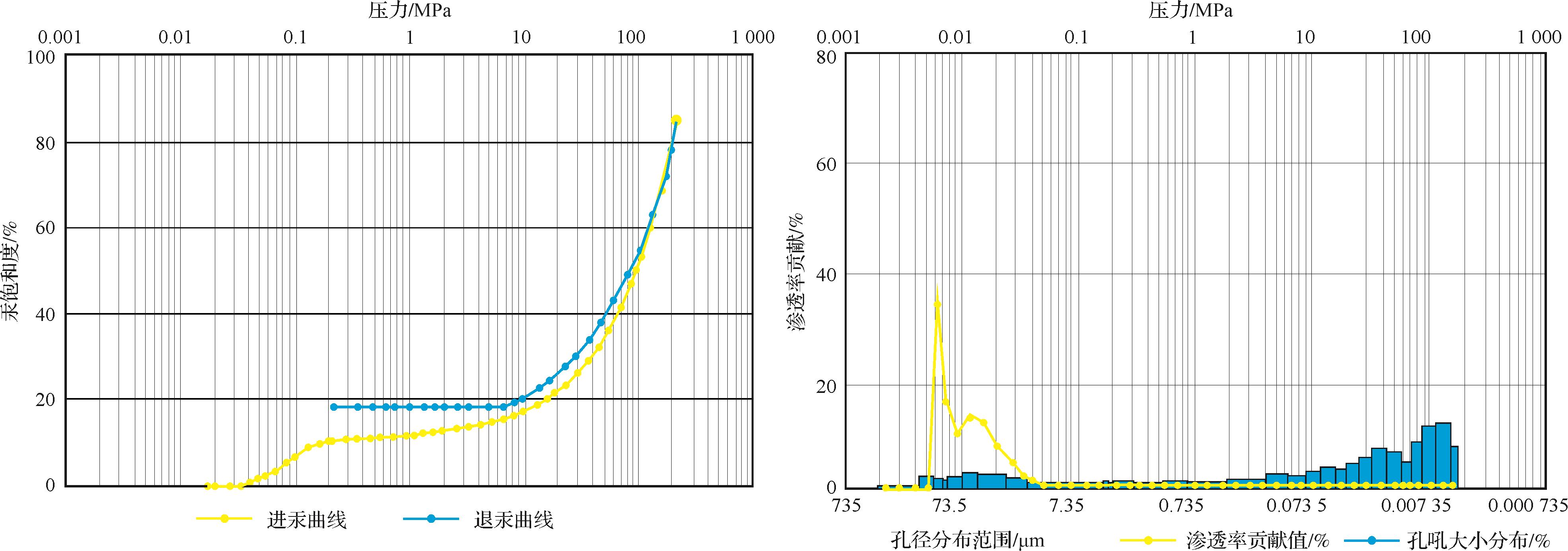 研究区上三叠统白果湾组富有机质泥页岩孔径分布范围较广,且不同区域内分布不一,孔隙具双峰分布特点。当进汞压力介于0.01~0.1 MPa时,进汞饱和度随压力的增加而增加,表明微米级大孔隙发育较好;当进汞压力在0.1~10 MPa时,进汞量变化较小,表明50~1 000 nm的大孔发育较差;当进汞压力在10~100 MPa时,进汞量大量增加,表明中孔发育较好。退汞率达78.14%,表明孔吼连通性较好(图9)。