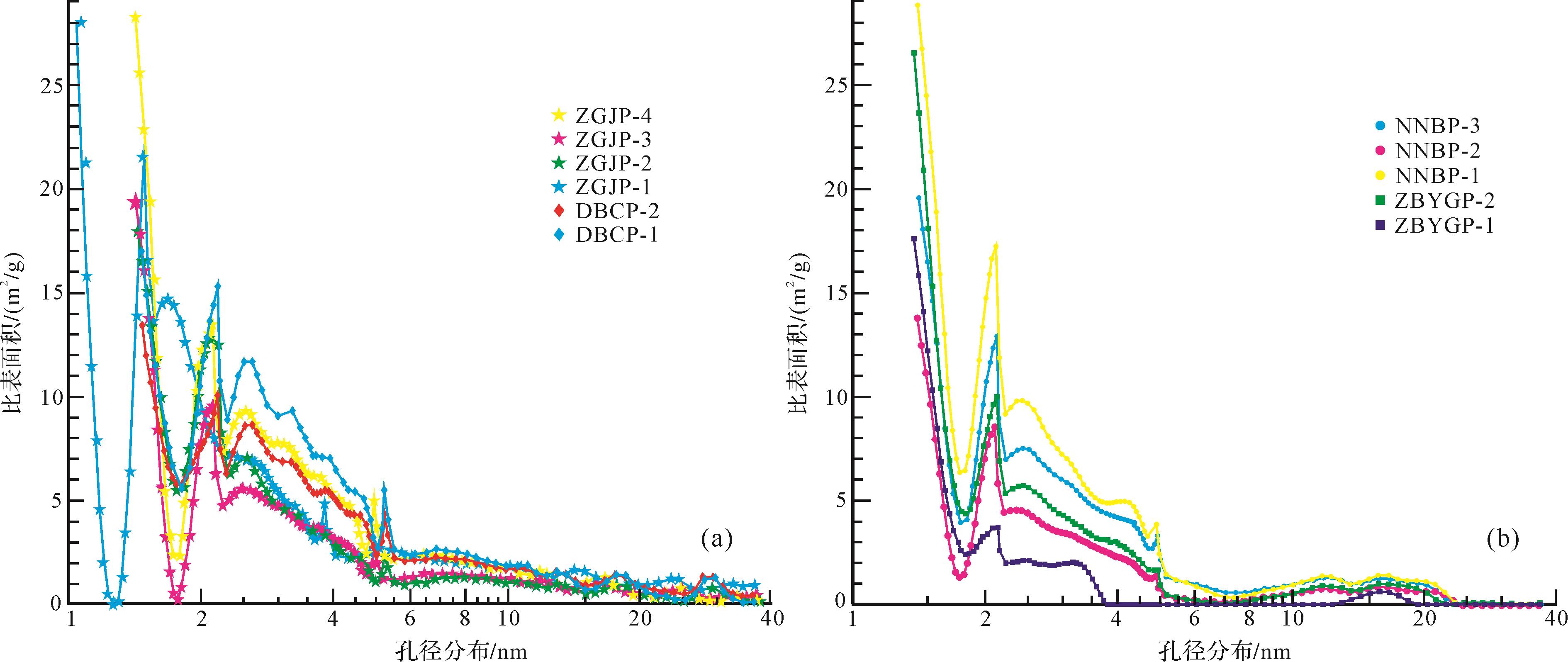 剖面名称 样品编号 BET孔隙比表面积/(m2/g) BJH孔隙比孔容/(cm3/g) BET孔隙直径/nm NNBP NNBP-4 10.62 0.025 9.41 NNBP-3 7.17 0.016 8.75 NNBP-2 13.69 0.030 8.57 ZBYGP ZBYGP-4 12.93 0.020 7.21 ZBYGP-3 8.34 0.020 8.46 ZGJP ZGJP-4 10.07 0.022 8.44 ZGJP-3 6.25 0.016 9.79 ZGJP-2 8.30 0.013 6.97 ZGJP-1 13.70 0.021 6.66 DBCP DBCP-3 9.04 0.019 8.56 DBCP-2 11.78 0.023 7.83 孔隙的比表面积在1.48~20 nm的孔径范围内具双峰、三峰分布特征,峰值主要出现在1.48~6 nm,少量出现在10~20 nm,结合比表面积随孔径的分布规律可以看出,孔隙以1.48~6 nm的微孔为主,10~20 nm之间的小孔次之(图10),泥页岩的微孔具有较强的自封闭能力,且其封闭能力受构造作用的影响较小[41⁃43]。研究区内上三叠统白果湾组富有机质泥页岩具有良好的页岩气储集空间。
