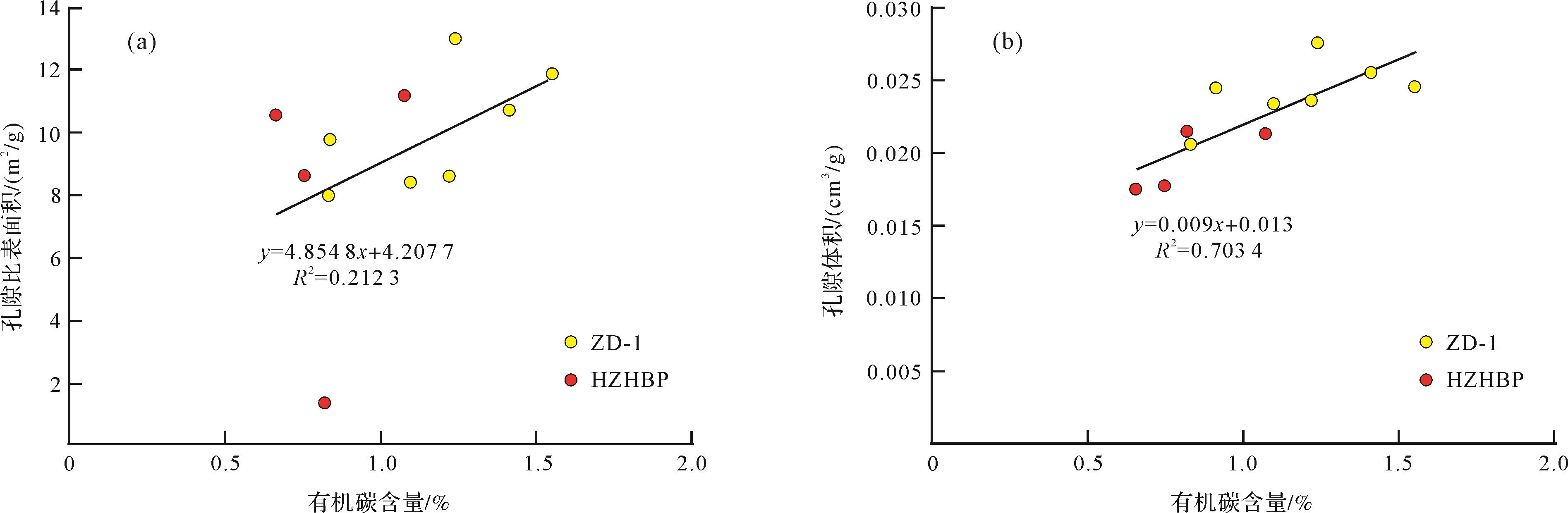 Figure 12. Relationships between organic carbon content and pore specific surface area and pore volume