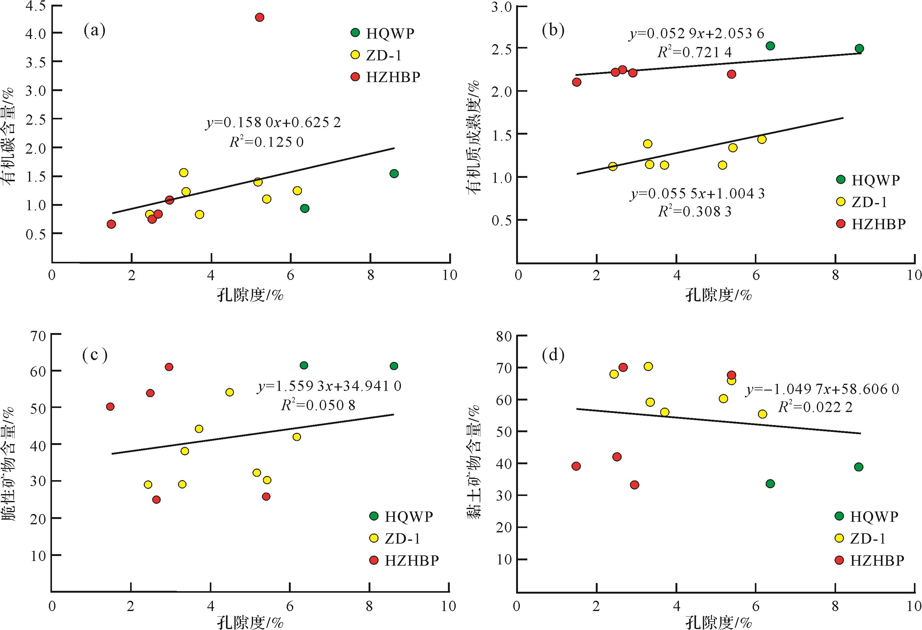 黏土矿物在脱水转化过程中产出大量层间水,形成黏土矿物层间孔、缝,同时伊利石转化过程中同样会产生大量微孔隙[57](不规则片状黏土矿物层间缝、粒缘孔缝以及粒间孔),这些孔隙对孔隙度贡献较大[56]。然而,研究区上三叠统白果湾组富有机质泥页岩黏土矿物含量与孔隙度之间具有微弱的负相关性(图13d),可能是微小的黏土矿物颗粒充填了部分孔隙,堵塞孔喉所致。