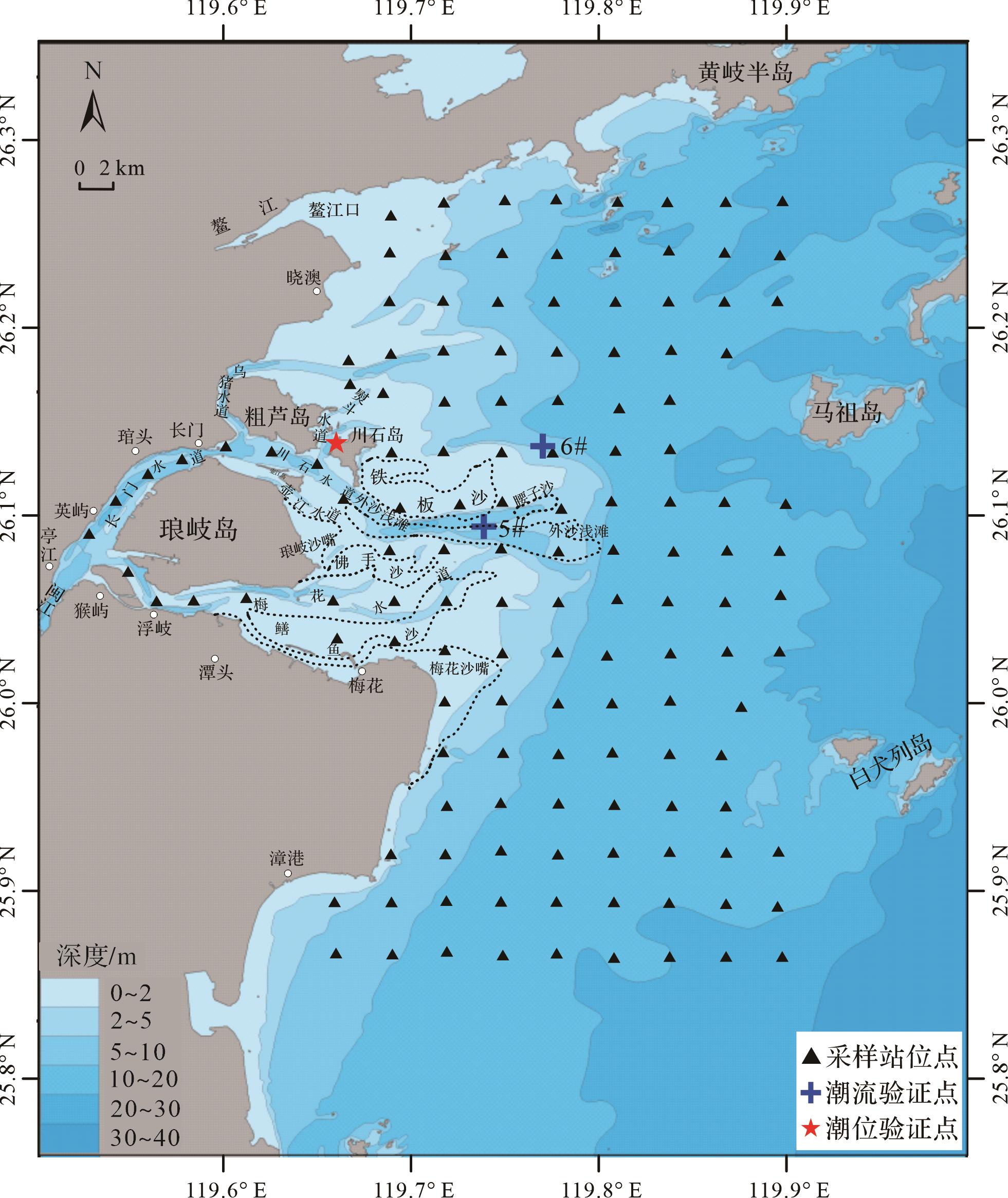 闽江是福建省沿海的第一大河流,发源于闽赣边界的武夷山脉,自北向南穿过闽北、闽中丘陵,流至竹岐进入福州盆地,在马尾汇合后穿越闽安峡谷,自亭江附近受琅岐岛阻隔,分为南支梅花水道和北支长门水道,北支出长门水道后受粗芦岛、川石岛及壶江岛等阻隔,又分为乌猪、熨斗、川石和壶江四个水道分别注入东海,其中川石水道为主航道,发育内沙和外沙两个浅滩,内沙浅滩位于川石水道口门,是川石水道的拦门沙体,外沙浅滩位于铁板沙下游(图1)。整个流域属于亚热带海洋季风气候区,多年平均径流量为605×108 m3,多年平均输沙量750×104 t,并且表现出明显的洪、枯季变化[16]。然而,近年来受人类活动影响,多年平均径流量没有明显变化,但入海泥沙通量锐减至原来的三分之一左右[14]。闽江河口地区平均潮差4.46 m(梅花站),潮汐类型为正规半日潮,平均落潮流速大于平均涨潮流速,潮流以往复流为主,具有一定的旋转流特征,年平均波高1.1 m[16]。闽江河口三角洲属于典型的山溪性强潮三角洲河口,河床纵坡降大,河口水下三角洲分布于口门至15 m等深线附近,主要受控于潮流和波浪,由河流汊道沉积、河口沙坝、口外浅滩以及口内外潮滩等组成[12⁃13];而在水下三角洲以外的离岸斜坡区,潮流沙脊发育[17⁃18]。