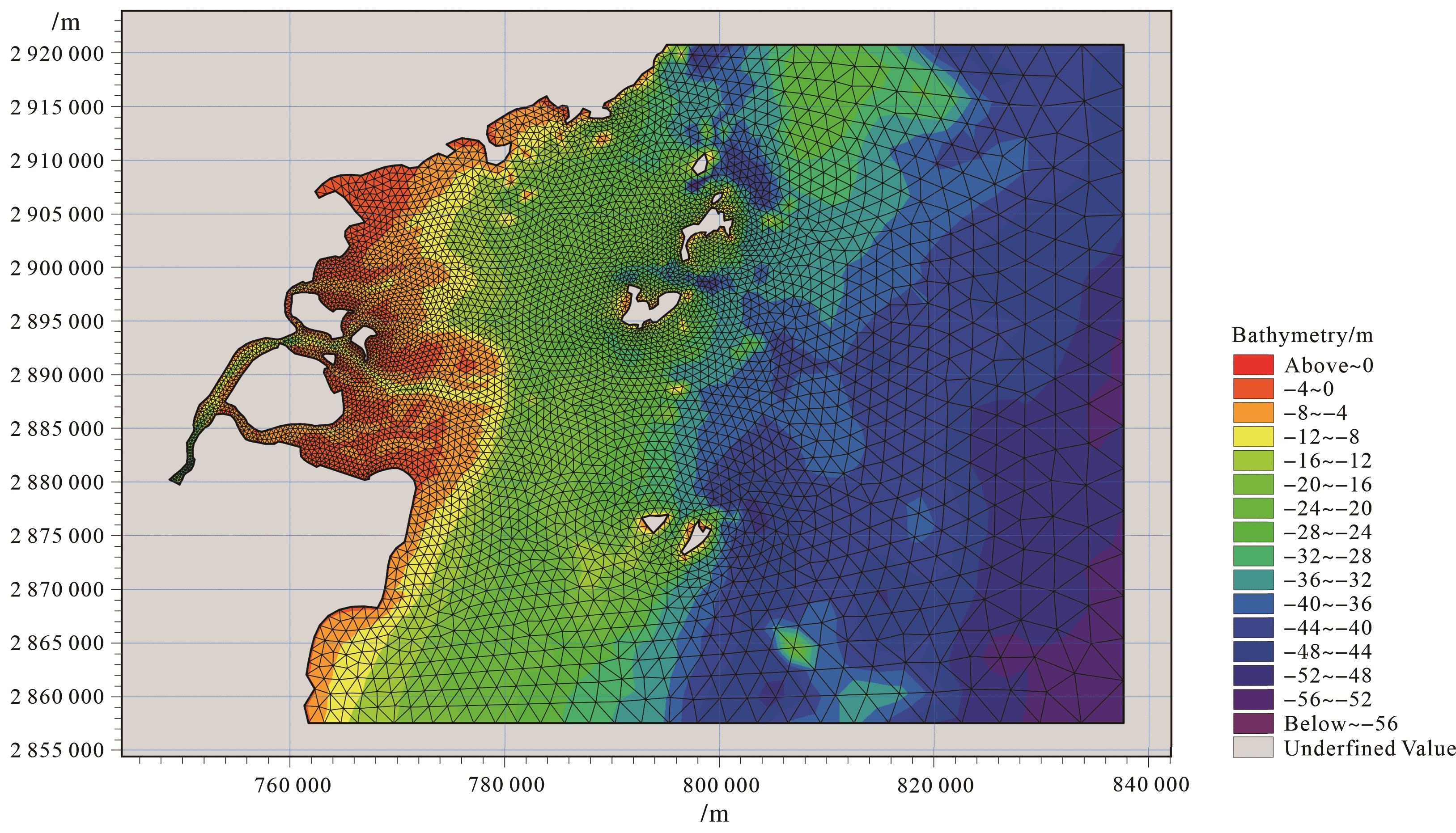研究区域模型东靠外海,西临闽江,模型的计算范围包括了整个闽江河口水下三角洲和水下岸坡区域,将闽江河口水下三角洲和水下岸坡区域作为重点研究区域并对此区域范围的网格进行加密,使其计算结果更加精确;整个模型区域内共有节点数5 773,网格数10 884(图2)。在上游闽江来水处设置开边界,边界条件以模型计算期间10天平均流量来控制(数据来源于福建省水文水资源勘测中心发布的《水文旬报》),外海域的开边界则设置为潮汐强迫开边界,基于全球潮汐模型数据预测开边界,时间间隔1 h。