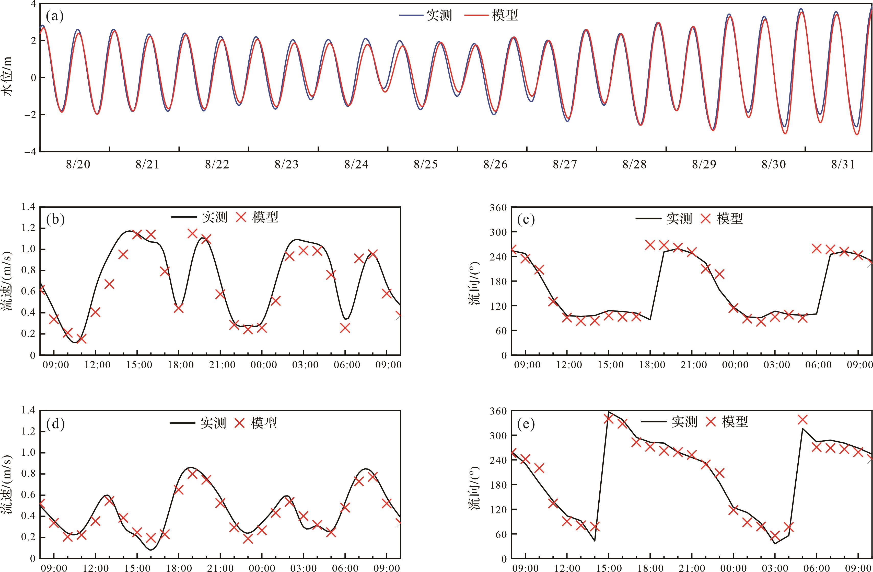 选取2019年8月的现场观测数据作为验证,模拟计算了2019年洪季期间(7—9月)闽江河口及周边海域水动力场,模型采用的时间步长为300 s,总步数14 976。模型参数设置中,浅水方程的CFL数设为0.8,涡粘系数取常数默认值0.28,在模型中考虑了干湿边界的交替变化,干水深为0.005 m,淹没水深为0.05 m,湿水深为0.1 m,均采用模型默认参数[25];床面阻力系数经率定后得到相对的Manning数,选取值为60[26]。计算期间未有极端天气发生,模型在模拟过程中不考虑风、降水和蒸发等因素,采用冷启动,模型的初始水位和初始速度均设置值为0。