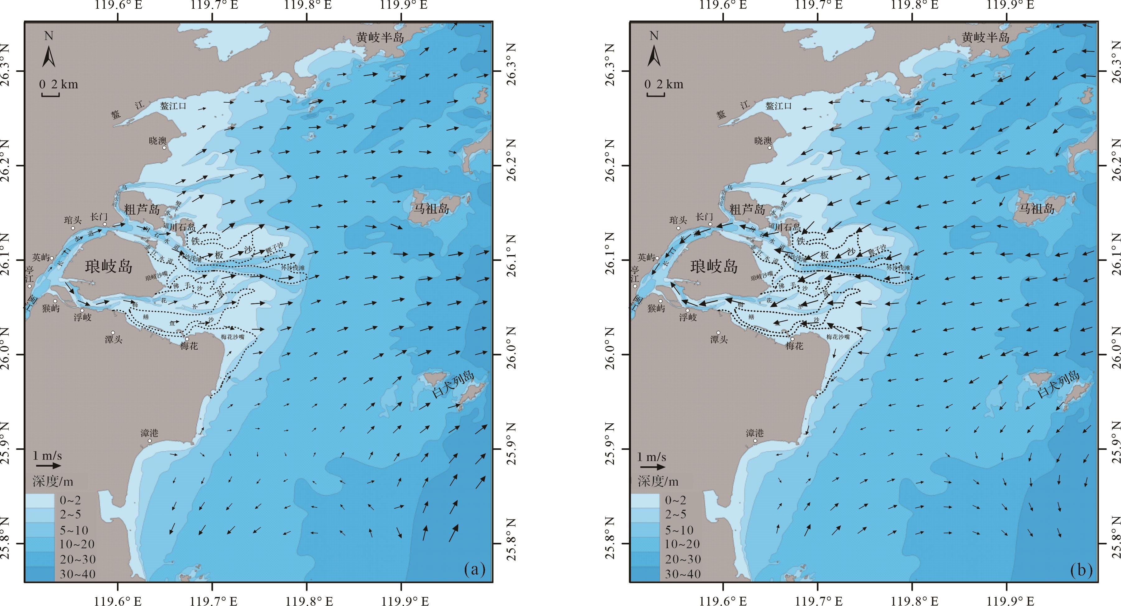 (1) 闽江河口及周边海域落潮流向整体上为东北向,而在闽江河口水下三角洲范围内流向存在由东南向、东向转变为东北向的变化,流速在0.15~1.35 m/s范围变化;涨急时刻潮流流速由外海域至闽江河口水下三角洲流速逐渐变大,流向整体上表现为西南向,在水下三角洲范围内流速在0.5~2.5 m/s范围变化。