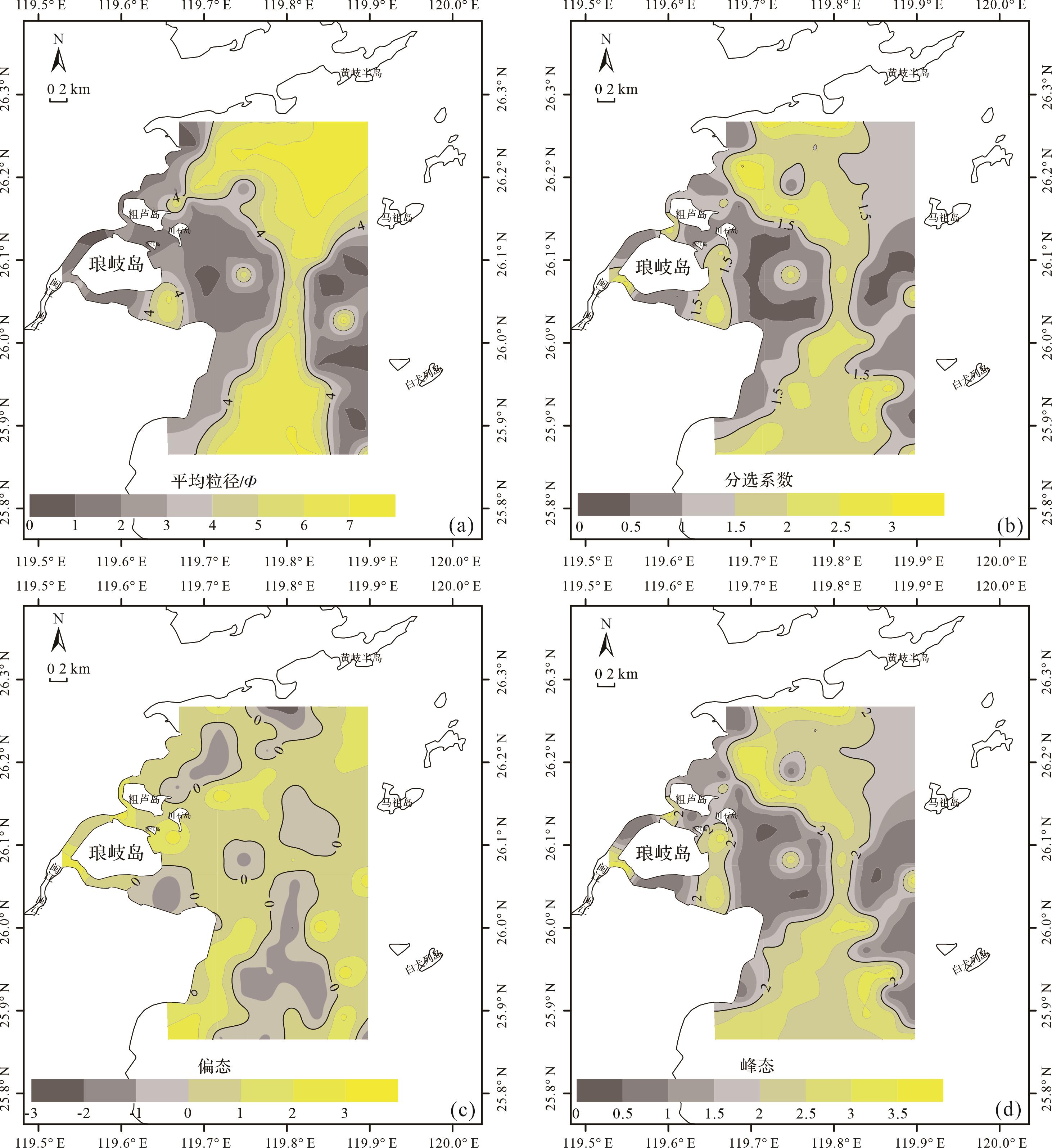 粒度参数计算结果显示,闽江河口及周边海域表层沉积物平均粒径为0.54~7.31 Φ,均值为4.09 Φ,在空间上表现为水下三角洲范围内和东南部分海域平均粒径较大(<4 Φ),研究区北部海域和南部海域沉积物平均粒径小(>6 Φ)(图6a)。沉积物分选系数为0.41~3.06,平均值为1.43,变化范围较大;在空间分布上表现为水下三角洲前缘分选程度较好,随着向河口外部延伸,沉积物分选程度总体变差(图6b)。沉积物偏态在-2.53~2.92之间变化,平均值为0.25,水下三角洲及东部海域大部分沉积物表现为正偏(图6c)。峰态范围为0.53~3.64,平均值为1.91,在空间分布上也表现出一定的变化规律(图6d)。