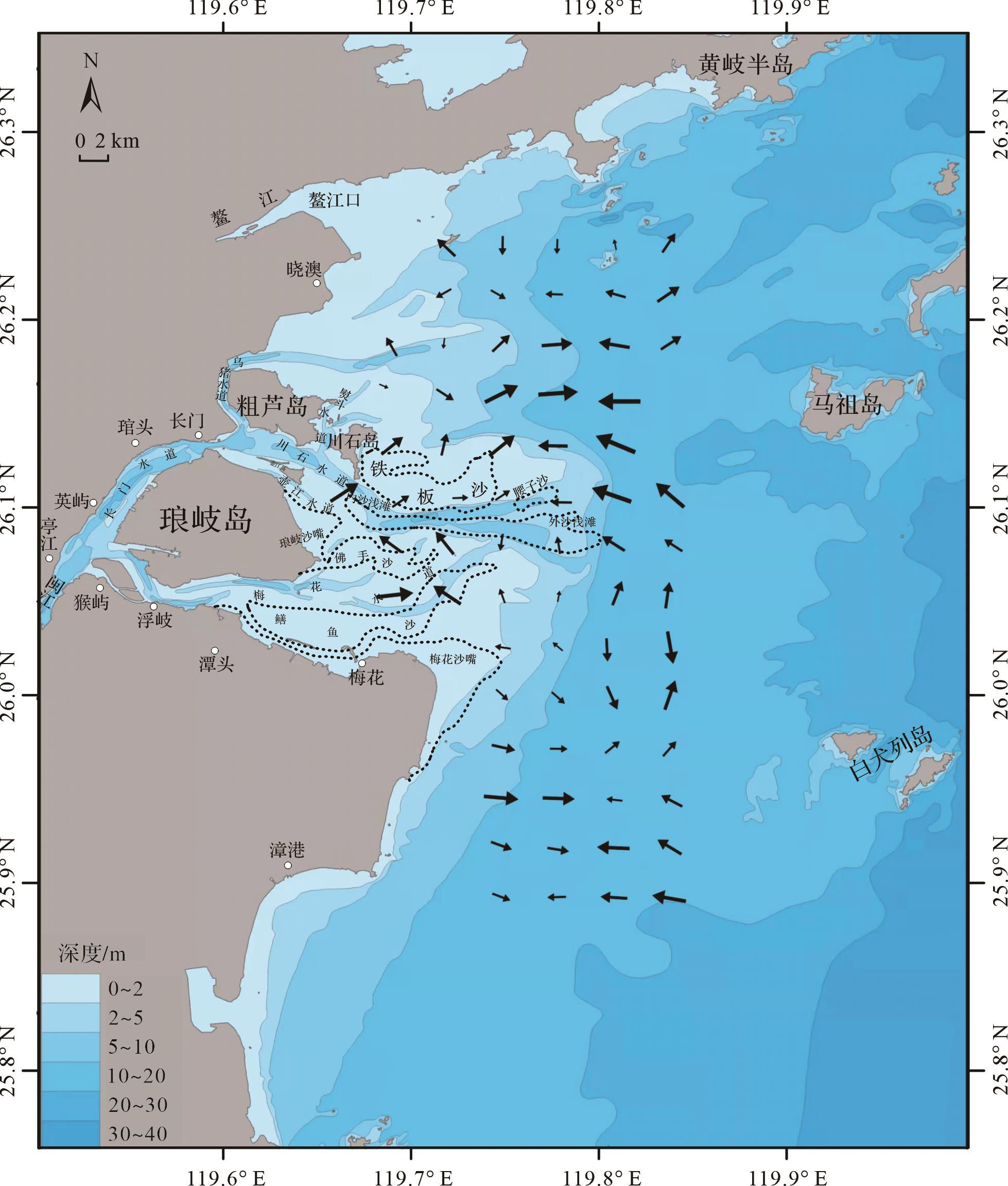 粒径趋势分析结果显示(图7),在闽江河口水下三角洲平原至三角洲前缘,闽江携带的入海沉积物在通过琅岐岛南侧的梅花水道和北侧的长门水道出闽江口门后,分别向东、东南和东北方向输运,并且在输运过程中不断发生沉积。南部入海沉积物在经梅花水道出口门后主要向东、东北和东南方向输运,部分沉积物在向东和东南方向的输运过程中不断发生沉积,在梅花水道口门附近形成了一系列水下浅滩(如鳝鱼沙、梅花浅滩等),其余沉积物则向东北方向输运,输运至梅花东北部海域后的沉积物转向西和西北方向输运,与出梅花水道输运的沉积物堆积在梅花沙嘴形成了大片的浅滩,继续向西北输运方向的沉积物则在川石岛南侧的内沙浅滩附近堆积。经长门水道的入海沉积物在出川石岛后向东和东北方向输运,在输运过程中沉积物在川石岛东南部不断发生堆积,在铁板沙、腰子沙一带形成粗颗粒堆积体。继续向东方向输运的沉积物与出梅花浅滩向东北输运的沉积物在外沙浅滩附近汇合,促进了外沙浅滩的发育。在三角洲前缘斜坡至前三角洲区域,部分沉积物在穿过外沙浅滩后受涨潮流的作用输运方向发生改变,向西和西北方向输运,进一步促进了腰子沙附近海域的沉积。其余出川石岛后向东和东北方向输运的沉积物继续向东和东北方向输运,输运至梅花以东的沉积物则继续向东和东南方向输运。在水下岸坡区域,沿东和东南方向输运的沉积物转变为西和西北方向输运,沉积物在口外东南侧海域交汇发生沉积并形成了大片的细颗粒沉积物。沿东北方向输运的沉积物在输运过程中,输运方向转变为西和西北方向,并与南向闽江河口输运的沉积物在口外东北侧海域沉积形成大片细颗粒沉积物。
