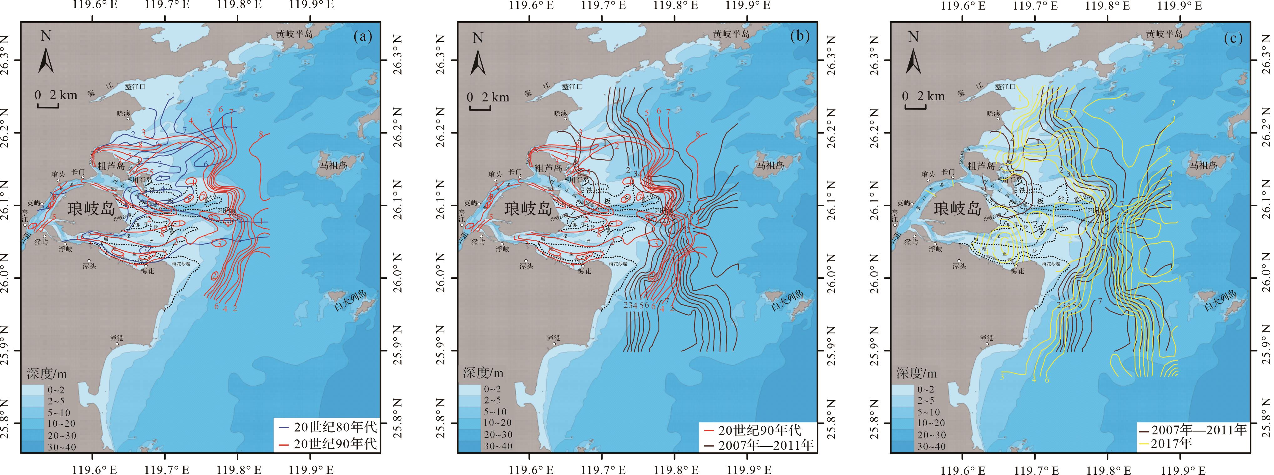 自2010年前后至2017年,闽江河口区沉积物中值粒径空间分布格局变化比较稳定,在水下三角洲前缘斜坡附近海域表层沉积物中值粒径较大的等值线(2 Φ)总体呈现向岸后退,中值粒径略微减小。总体来说,该时段沉积环境处于基本稳定状态(表4),仅在川石岛东北侧海域出现较明显的变化(图10c)。将2010年前后的沉积物粒度分析结果按上述沉积环境分区进行统计、对比,显示各沉积环境分区在该时段内表层沉积物中值粒径变化微小,各粒度参数变化也相对稳定(表4)。对比沉积区I和沉积区II,沉积物略微粗化的现象,这也说明在该时段闽江河口水下三角洲前缘、水下三角洲前缘斜坡等海域依然存在一定程度的侵蚀,与中值粒径空间分布对比结果一致(图10c)。该变化与闽江入海泥沙通量持续减少及海砂开采活动有关。自2010年后,闽江入海泥沙通量持续减少,使得沉积区I和II所在区域海底持续侵蚀(图11)。
