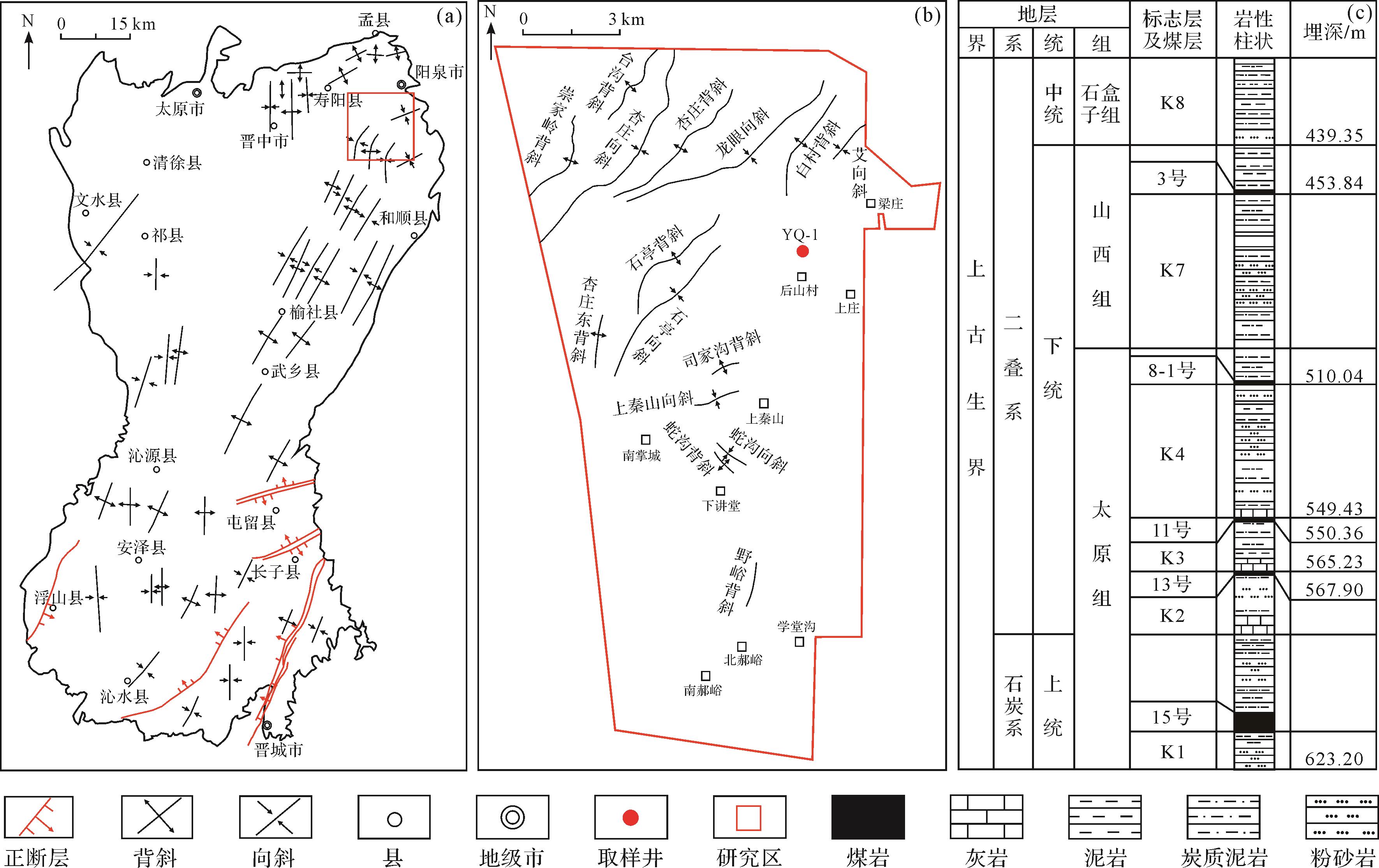 沁水盆地位于华北地台中部,山西省东南部[19],整体表现为近南北向的大型复式向斜构造盆地。盆地四周为隆起包围,北部为五台山隆起,南部为中条山隆起,东部为太行山隆起,西部为吕梁山隆起及霍山隆起[20]。盆地雏形形成于印支运动,受燕山运动强烈挤压作用的影响,盆地形成向斜构造,在喜山运动多幕构造作用下,盆地接受多期构造拉张、挤压,最终形成了现今的构造格局[21]。断层集中分布于盆地东部及西部,断层规模及性质差异大,以正断层为主[22],多呈北东向,局部呈近东西向和北西向(图1a)。 盆地沉积环境经历了华北陆表海盆地、内陆表海海陆交替沉积为主的近海坳陷以及陆相碎屑岩沉积为主的内陆坳陷的古地理演化过程,晚古生代末期,随着古蒙古洋的闭合,海水向南退出,华北板块内部转化成大型的内陆湖泊沉积环境。作为主要的煤系页岩发育层,盆地北部太原组处于海陆过渡相的沉积环境,其中太原组下段以细粒沉积的三角洲前缘亚相为主,太原组中段沉积时期,伴随大规模海侵事件的发生,研究区发育碳酸盐岩台地及潮坪潟湖亚相,太原组上段主要发育潮坪沼泽相,岩性包括煤、页岩、砂质泥岩、灰岩、粉砂岩及少量泥灰岩。与海相页岩相比,煤系页岩单层厚度小,通常在40 m以下,纵向多层发育,与粉砂岩、泥灰岩和煤层互层,横向变化快。