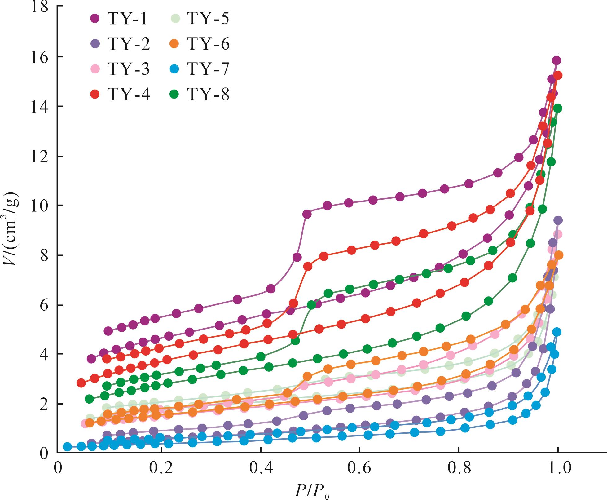 孔隙结构包括孔隙形态、孔径大小、孔体积、比表面积等参数[25⁃26],对气体的储集、吸附及运移能力等均具有重要意义。由于孔隙的毛细凝聚作用,低温氮气吸附实验中吸附曲线与脱附曲线会发生明显的吸附滞后现象,造成同一相对压力条件下,脱附曲线气体吸附量高于吸附曲线,形成明显的迟滞环[27⁃28]。 根据低温氮气吸附—脱附曲线形态(图2),在相对压力(P/P0)小于0.9时,随着相对压力的增加,气体吸附量呈缓慢上升,当P/P0>0.9时,随着相对压力的增加,气体吸附量急剧增加。以P/P0=0.5为界线将曲线分为“高压段”(P/P0>0.5)及“低压段”(P/P0<0.5),在低压段,吸附曲线与脱附曲线形态一致,但是二者不重合,在高压段,吸附曲线与脱附曲线形态差异明显,二者存在明显的吸附滞后现象。根据国际理论与应用化学(IUPAC)对等温吸附曲线及迟滞环类型划分[29],太原组煤系页岩氮气吸附曲线及迟滞环形态与Ⅳ型等温吸附曲线和H3型迟滞环类型相似。显示太原组煤系页岩中微孔、介孔和宏孔均有发育,其中以介孔为主,孔隙形态以半封闭型狭缝孔为主,同时具有墨水瓶状孔隙。   Figure 2. Low⁃temperature nitrogen adsorption curve of the Taiyuan Formation coal⁃measure shale in the northern Qinshui Basin 太原组煤系页岩孔隙总孔容介于0.023 0~0.058 0 mL/g,平均为0.040 9 mL/g,其中孔径小于2 nm的微孔平均孔容为0.004 5 mL/g、孔径在2~50 nm的介孔平均孔容为0.021 4 mL/g、孔径大于50 nm的宏孔平均孔容为0.015 0 mL/g。显示介孔的孔容贡献率最大,宏孔次之,微孔最小。比表面积介于14.70~41.50 m2/g,平均为28.48 m2/g,其中微孔比表面积贡献率最大,平均为17.24 m2/g,介孔次之(10.08 m2/g),宏孔最小(1.16 m2/g)。