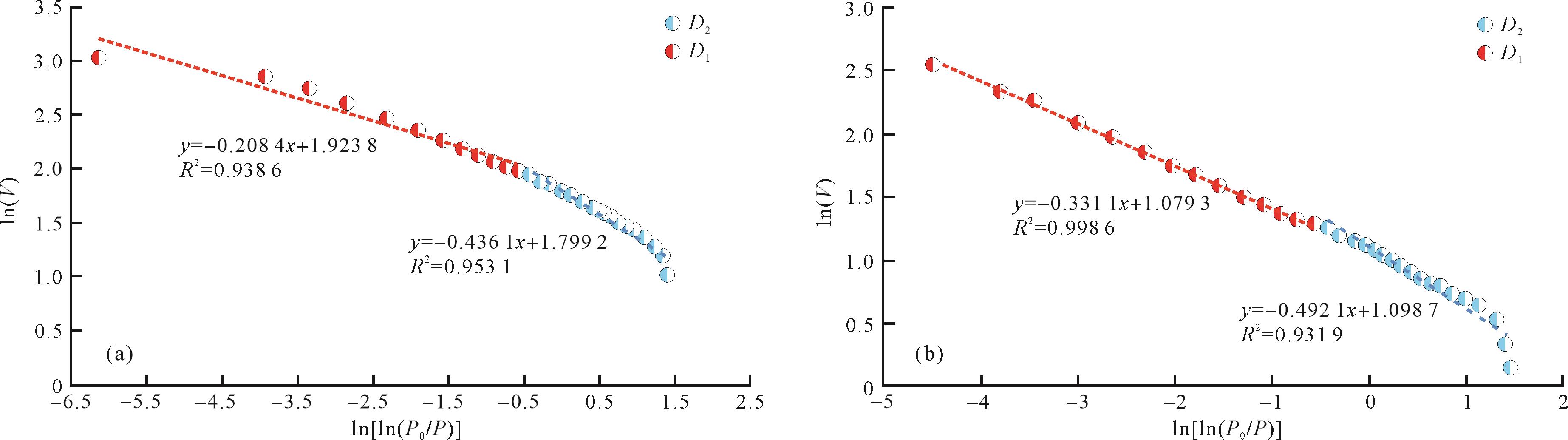 页岩微观孔隙类型多样,孔隙结构受有机质含量、有机质热演化程度及无机矿物含量等因素共同影响,具有较强的复杂性及非均质性。分形维数的大小可以量化评价孔隙的复杂程度[30⁃31]。煤系页岩低温氮气吸附—脱附曲线具有明显的吸附不重合现象,根据曲线形态及迟滞环类型,指示页岩中以微孔及介孔发育为主,这与FHH模型适用孔径范围一致[32],因此采用FHH模型计算样品孔隙的分形维数大小,具体计算表达式为: ln V=K ln[ln(P 0/P )]+ C(1) D=K+3 (2) 式中:V为在不同相对压力条件下吸附气体体积,m3;P0表示饱和蒸汽压力,MPa;K为拟合直线斜率;C为常数;D为分形维数。 利用吸附—脱附曲线的吸附支气体吸附量及相对压力制作吸附曲线lnV与ln[ln(P0 / P)]关系曲线(图3),低温氮气吸附曲线上相对压力在0.45~0.5时出现迟滞环,表明在该相对压力前后所指示的孔隙结构出现明显差异。根据图3双对数曲线特点,以P/P0=0.5为界线,对吸附曲线高压及低压段进行分段线性拟合,计算不同压力段拟合直线的斜率,采用式2计算样品分形维数大小,结果显示页岩孔隙存在两种不同的分形特征,且二者之间拟合关系良好。记低相对压力段(0<P/P0<0.5)孔隙分形维数为D1,高相对压力段(P/P0>0.5)孔隙分形维数为D2[33⁃36]。结果显示沁水盆地北部太原组煤系页岩孔隙结构分形维数(D)介于2.507 9~2.809 3,处于较高水平,显示页岩孔隙结构复杂。不同页岩样品均显示出明显的分段分形特点,在高相对压力及低相对压力条件下的样品分形维数具有明显差异,高相对压力段(P/P0>0.5),页岩孔隙的分形维数D2介于2.527 1~2.809 3,平均为2.699 7,在低相对压力段(P/P0<0.5),孔隙分形维数D1介于2.507 9~2.663 9,平均为2.594 0(表2)。   Figure 3. Relationship between lnV and ln[ln(P0/P)] of the Taiyuan Formation coal⁃measure shale samples in the northern Qinshui Basin 样品编号 P/P0<0.5 P/P0>0.5 分形拟合方程 R2 D1 分形拟合方程 R2 D2 TY-1 y=-0.436 1x+1.799 2 0.953 1 2.563 9 y=-0.208 4x+1.923 8 0.938 6 2.791 6 TY-2 y=-0.492 1x+1.098 7 0.998 6 2.507 9 y=-0.331 1x+1.079 3 0.931 9 2.668 9 TY-3 y=-0.417 3x+1.702 2 0.987 4 2.582 7 y=-0.303 8x+1.757 5 0.983 7 2.696 2 TY-4 y=-0.411 7x+1.680 7 0.963 2 2.588 3 y=-0.190 7x+1.778 0 0.935 5 2.809 3 TY-5 y=-0.386 6x+1.394 0 0.995 2 2.613 4 y=-0.247 9x+1.410 3 0.985 0 2.752 1 TY-6 y=-0.403 3x+1.052 4 0.969 4 2.596 7 y=-0.285 3x+1.144 0 0.987 0 2.714 7 TY-7 y=-0.453 5x+2.160 3 0.986 5 2.546 5 y=-0.472 9x+2.088 7 0.998 3 2.527 1 TY-8 y=-0.344 3x+2.119 1 0.983 1 2.655 7 y=-0.362 0x+1.915 5 0.961 1 2.638 0 Table 2. Fractal dimension of pores from the coal measure shale in the Taiyuan Formation