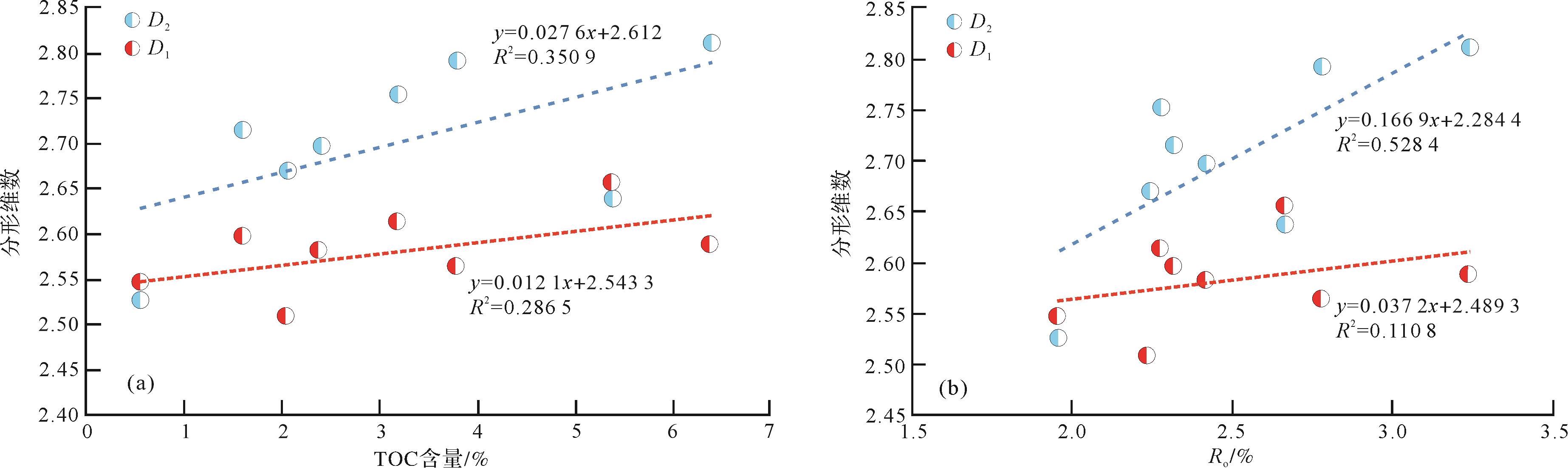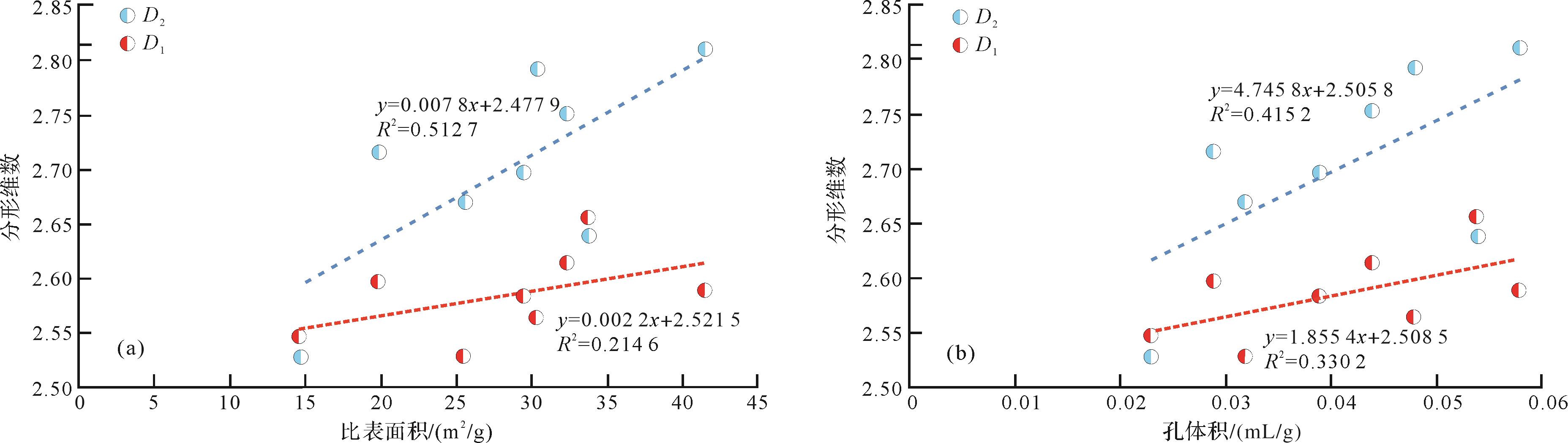 分形维数的引入主要为了量化页岩孔隙的复杂程度,进而指示页岩孔隙对气体的吸附能力,一般而言,分形维数越大指示孔隙越复杂,对气体的吸附能力越强[35⁃36]。根据页岩中气体赋存状态差异,孔体积及比表面积分别控制游离气及吸附气含量,页岩微孔及介孔贡献页岩绝大多数的孔体积,微孔对页岩比表面积的贡献更高,尽管微孔孔体积较小,但由于数量较多,孔隙结构复杂,对孔隙的复杂程度及非均质程度具有至关重要的作用,页岩中微孔越发育,孔隙结构越复杂,比表面积越大。页岩分形维数与页岩孔体积及比表面均呈正相关关系,其中页岩比表面积与D1及D2相关系数分别为0.214 6与0.512 7(图5a),而页岩孔体积与D1及D2的相关系数分别为0.330 2与0.415 2(图5b)。在孔体积、比表面积与分析维数的相关关系中,结构分形维数与孔体积及比表面积的相关性更强,表明页岩微孔、介孔越发育,孔体积及比表面积越大,页岩孔隙越复杂,分形维数越高。