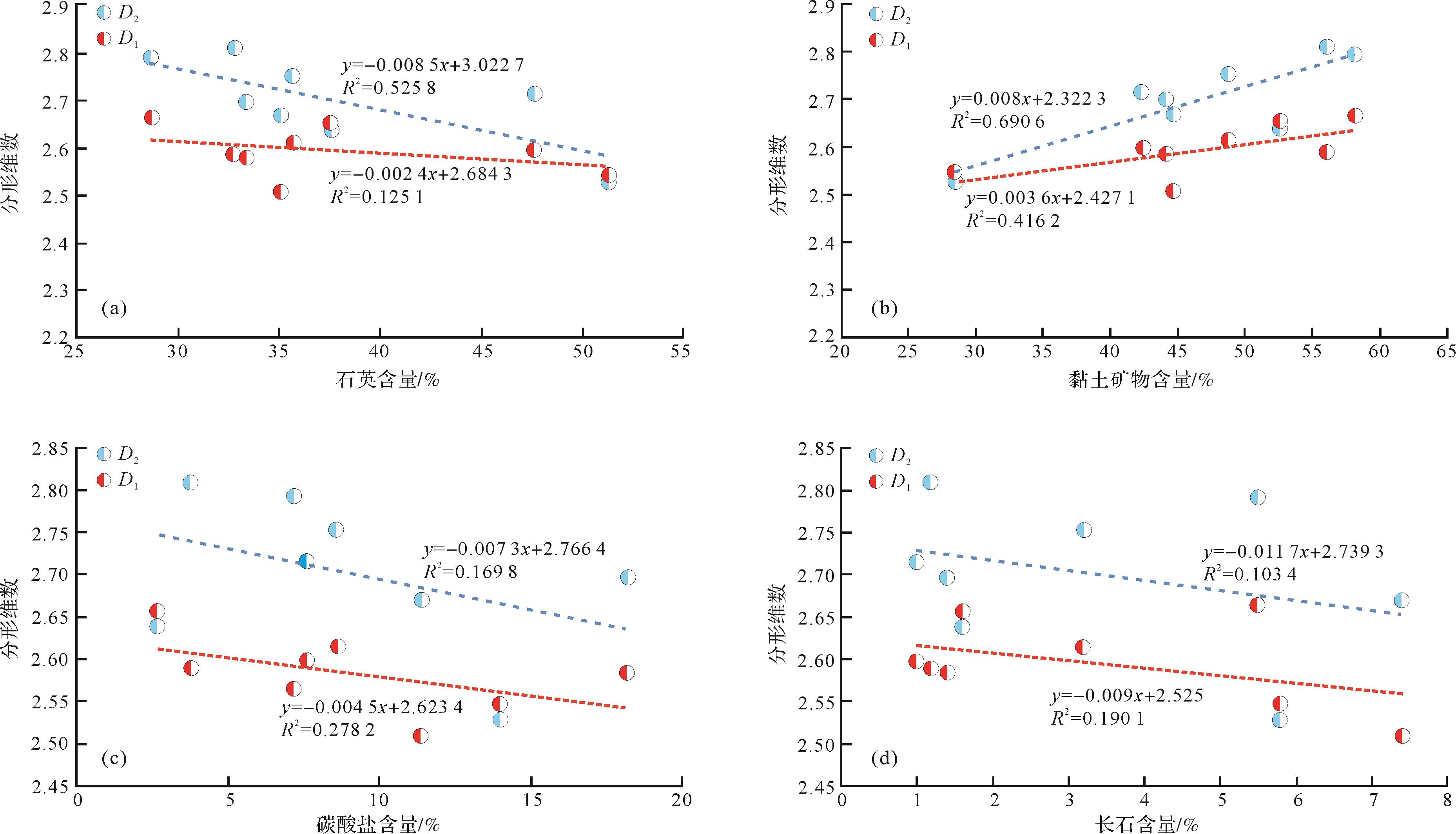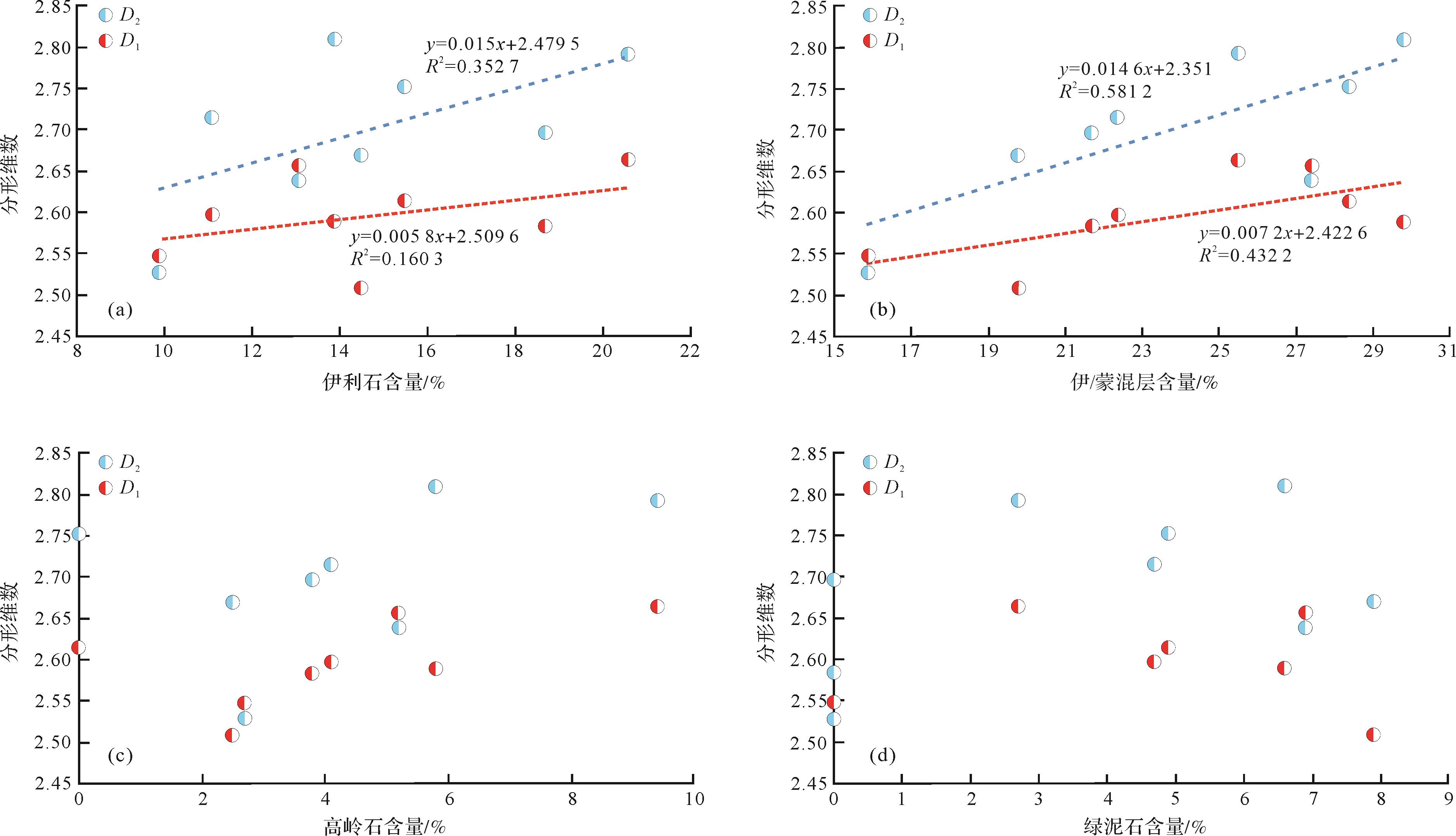 分形维数大小能定量表征孔隙复杂程度,其大小与孔隙发育直接相关[7,33⁃34],因此,控制页岩孔隙的因素均会影响分形维数的大小。主要影响因素包括页岩矿物组分、有机质含量、热演化程度、埋藏深度及成岩演化阶段等,其中成岩矿物是无机孔隙发育的直接载体,控制着无机孔隙的发育。根据矿物组成差异,可以分为硅质矿物、碳酸盐岩矿物及黏土矿物三大类。分别对这三类矿物组分含量与D1及D2进行相关性分析(图6),结果显示石英含量与D1及D2之间均呈弱负相关关系,相关系数分别为0.125 1与0.525 8,长石含量与D1及D2呈负相关性,相关系数分别为0.190 1与0.103 4,黏土矿物含量与D1及D2之间均呈正相关关系,相关系数分别为0.416 2与0.690 6,方解石、白云石等碳酸盐岩矿物与D1及D2呈负相关关系,相关系数分别为0.278 2与0.169 8。在与分形维数呈负相关的无机矿物中,石英矿物含量与分形维数的相关系数最高,结合全岩矿物组分分析结果,其主要原因为石英含量高。 前人针对川东南、川南海相页岩分形维数研究指出石英矿物所能提供的储集空间有限,主要孔隙类型为晶间孔以及微裂缝[32],石英含量与孔隙分形维数呈正相关关系[36,38],主要是由于低等硅质生物死亡后,能提供有机质及硅质两种物质,硅质生物复杂体腔孔及有机质的增加放大了石英与分形维数的相关性。而沁水盆地太原组煤系页岩石英含量与分形维数呈负相关关系,对比海相页岩石英含量及石英成因,造成研究区石英含量与分形维数负相关的原因可能为太原组煤系页岩中硅质来源包括陆源碎屑硅及自生石英两种。随着石英总含量的降低,陆源碎屑石英含量占比增加[34],这类硅质通常经过远距离的搬运与沉积,造成矿物的分选性及磨圆度均较高,在压实成岩过程中,矿物排列支撑能力强,孔隙形态规则简单,降低了这部分孔隙的复杂性。 页岩的分形维数与碳酸盐岩矿物及长石含量均呈负相关关系,但是相关系数较小,其中碳酸盐岩矿物与D1及D2的相关系数分别为0.278 2与0.169 8,其原因主要为碳酸盐岩作为易溶矿物,在沉积埋藏过程中,受地层水及有机质生烃中产生的少量有机酸影响形成溶蚀孔,这些溶蚀孔的孔径通常较大,仅能提供有限的比表面积。结合前人分析碳酸盐岩对页岩孔隙结构的影响,碳酸盐岩矿物含量与页岩比表面积呈负相关关系,对宏孔的发育具有促进作用[31],因此,碳酸盐岩矿物的发育与页岩分形维数呈负相关关系。长石作为易溶矿物的一种,在埋藏过程中容易形成溶蚀孔,但抗溶蚀能力强于碳酸盐岩矿物,在埋藏过程中碳酸盐岩矿物会优先溶蚀,同时,陆源碎屑长石在长距离搬运沉积,以介—宏孔发育为主[31⁃32],导致长石含量与页岩分形维数相关系数低于碳酸盐岩。 海陆过渡相煤系页岩黏土矿物含量较高,研究样品黏土矿物平均含量在42%以上,是微观孔隙的重要载体,结合黏土矿物含量与孔隙分形维数的相关性分析,黏土矿物含量与D1及D2均呈正相关关系,相关系数分别为0.416 2与0.690 6(图6b),处于较高水平。结合前人研究成果,沁水盆地海陆过渡相页岩黏土矿物含量与页岩微孔及介孔均具有一定的相关性,同时,黏土矿物中发育较多的宏孔[16]。结合黏土矿物与分形维数相关系数大小分析,黏土矿物含量的增加对微孔、介孔及宏孔的发育均有促进作用。推测主要是由于海陆过渡相煤系页岩中黏土矿物总含量较高,矿物颗粒细小。尽管在压实作用过程中,黏土矿物颗粒趋向定向排列,孔隙空间会变小,但伴随着压实作用,孔隙中微孔及介孔的数量会增加,这也导致黏土矿物含量与页岩的分形维数呈较强的正相关关系。 黏土矿物组成以伊利石及伊/蒙混层发育为主,高岭石与绿泥石发育较少,部分样品并未检测到这两种黏土矿物,因此主要分析伊利石及伊/蒙混层含量与分形维数关系。结果显示,伊/蒙混层含量与页岩孔隙分形维数D1与D2均呈明显的正相关关系,相关系数分别为0.432 2与0.581 2,而伊利石与孔隙分形维数D1无明显相关性,与D2相关系数为0.352 7,高岭石及绿泥石与分形维数均无明显的相关关系(图7)。这主要与在不考虑页岩含水率的前提下相同温压条件的蒙脱石对气体的吸附能力高于伊利石有关[35]。不同黏土矿物颗粒发育微观孔隙类型及结构亦存在明显的差异,其中伊/蒙混层通常呈蜂窝状、棉絮状,主要发育粒间孔及粒内孔。同时,由于混层矿物堆叠方式,孔隙形态包括楔状及不规则状,孔隙结构复杂,伊利石呈片状,发育片间孔,孔隙结构相对简单,造成伊/蒙混层的吸附能力高于伊利石。此外,研究区煤系页岩中伊/蒙混层含量较高,也是导致伊/蒙混层含量与分形维数相关性高于伊利石的重要原因。